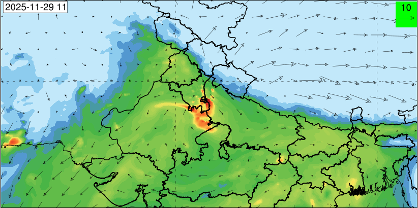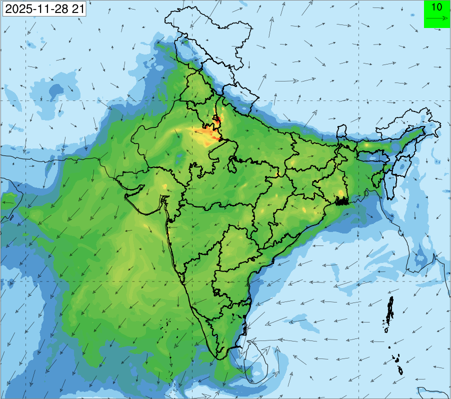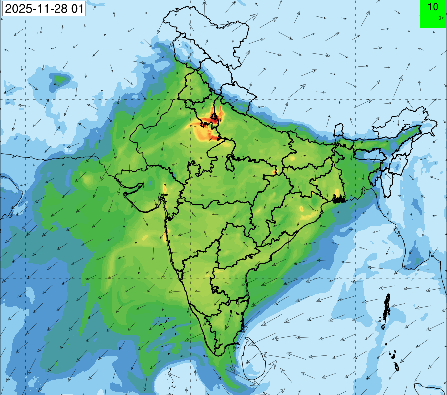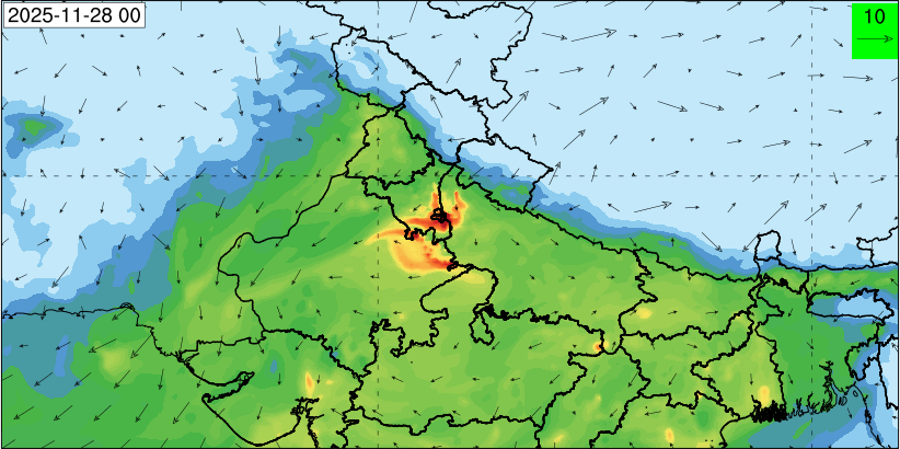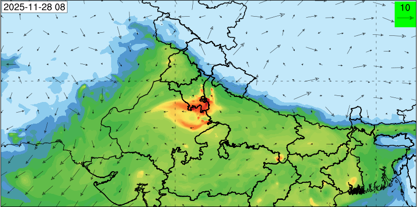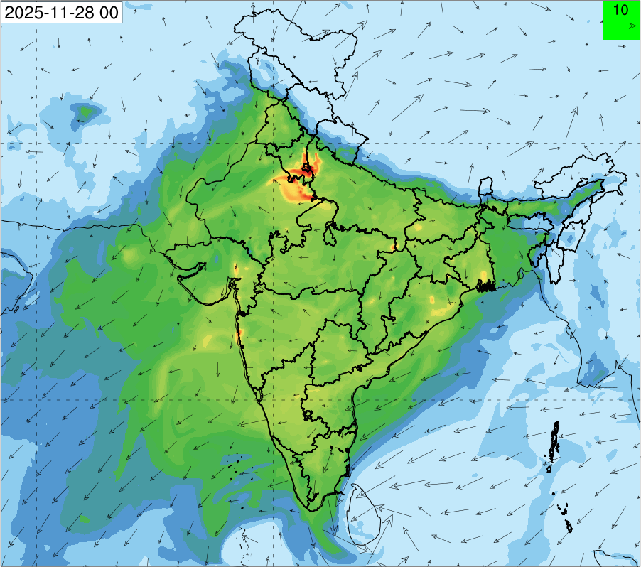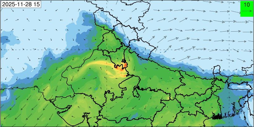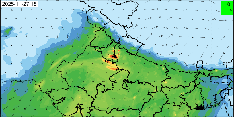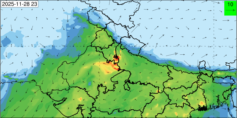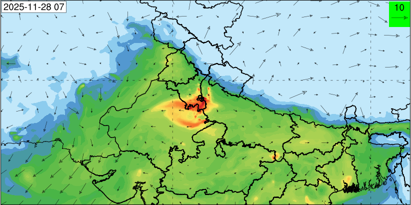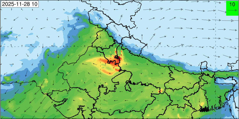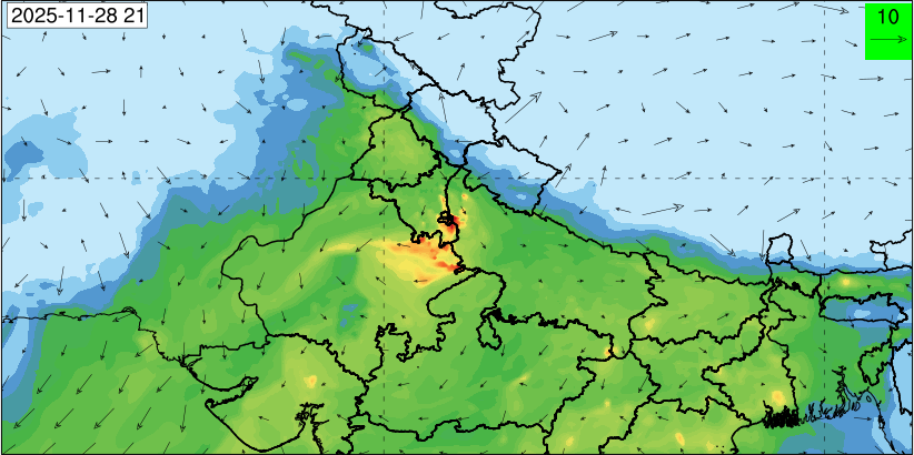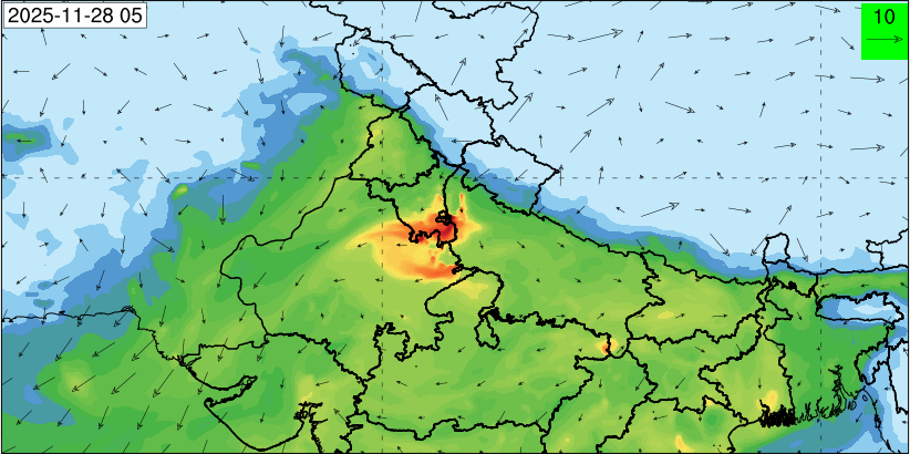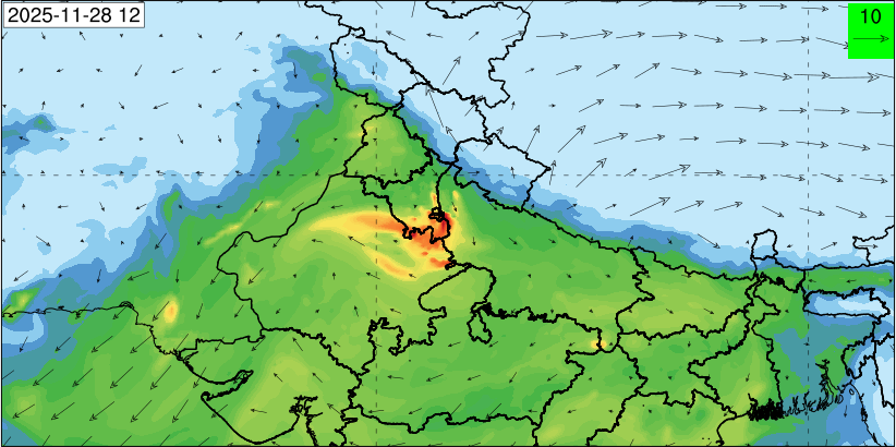 3. Predicted maximum mixing depth is likely to be 1050 m on 28.11.2025, 1450 m on 29.11.2025, 1000 m on 30.11.2025, and 1100 m on 01.12.2025 over Delhi. Ventilation index is likely to be 4500 m2/s on 28.11.2025, 8500 m2/s on 29.11.2025, 6000 m2/s on 30.11.2025 and 4500 m2/s on 01.12.2025 over Delhi. The ventilation index lower than 6000 m2/s with average wind speed less than 10 kmph is unfavourable for dispersion of pollutants.