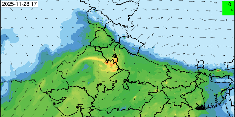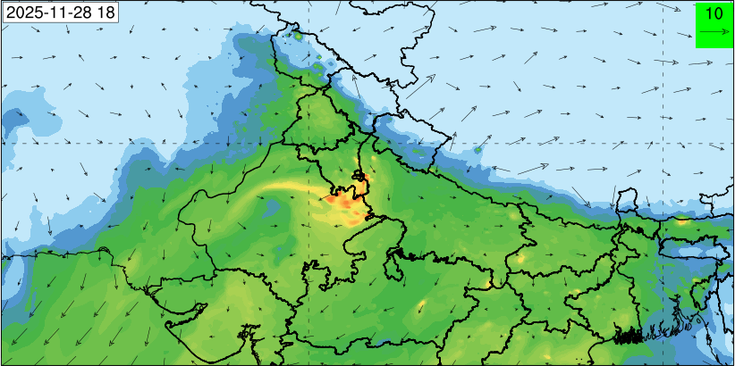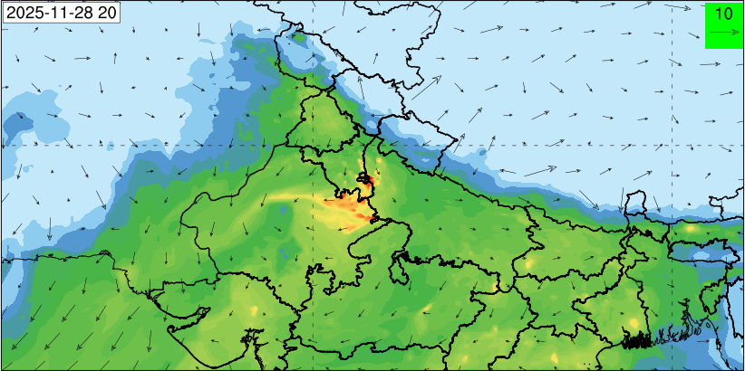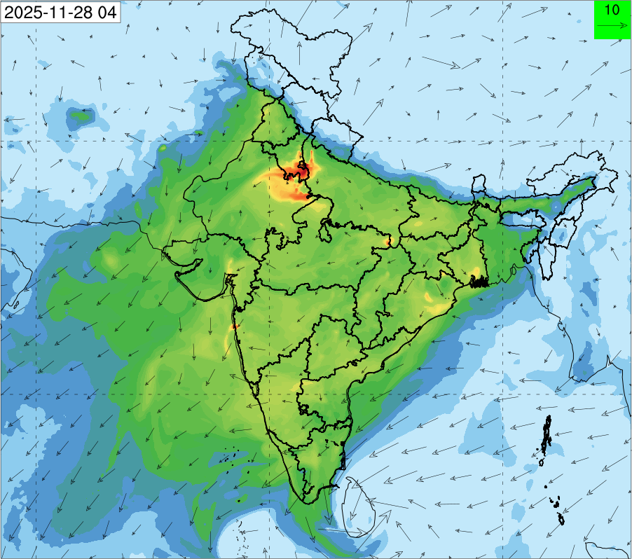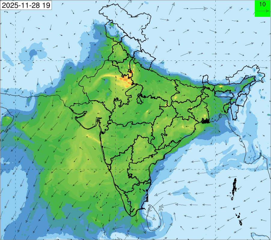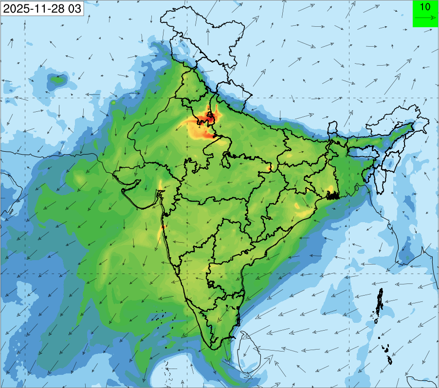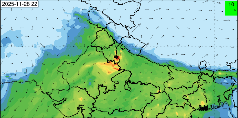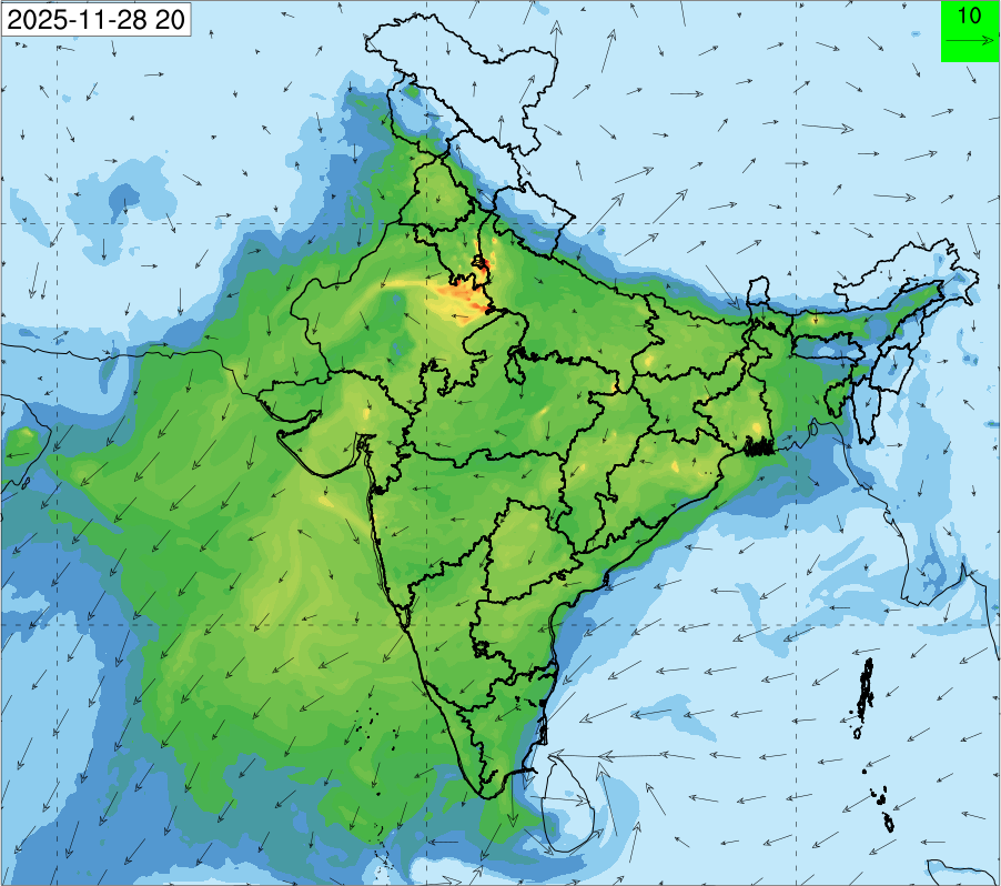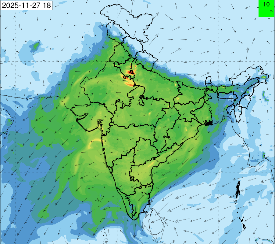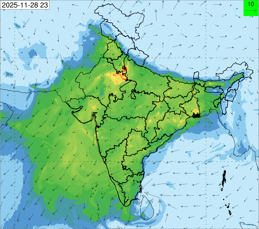 3. Predicted maximum mixing depth is likely to be 1050 m on 28.11.2025, 1450 m on 29.11.2025, 1000 m on 30.11.2025, and 1100 m on 01.12.2025 over Delhi. Ventilation index is likely to be 4500 m2/s on 28.11.2025, 8500 m2/s on 29.11.2025, 6000 m2/s on 30.11.2025 and 4500 m2/s on 01.12.2025 over Delhi. The ventilation index lower than 6000 m2/s with average wind speed less than 10 kmph is unfavourable for dispersion of pollutants.