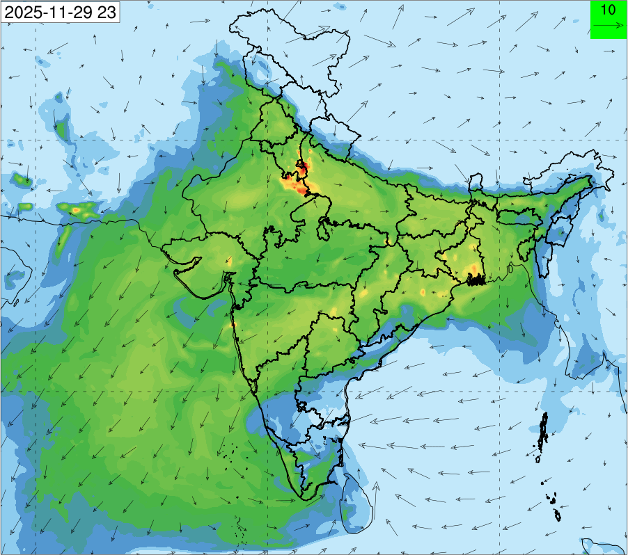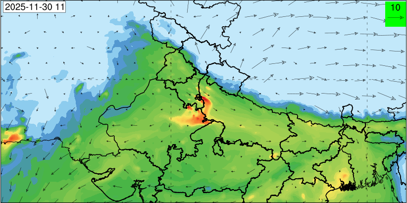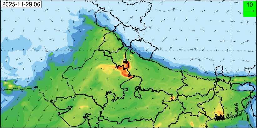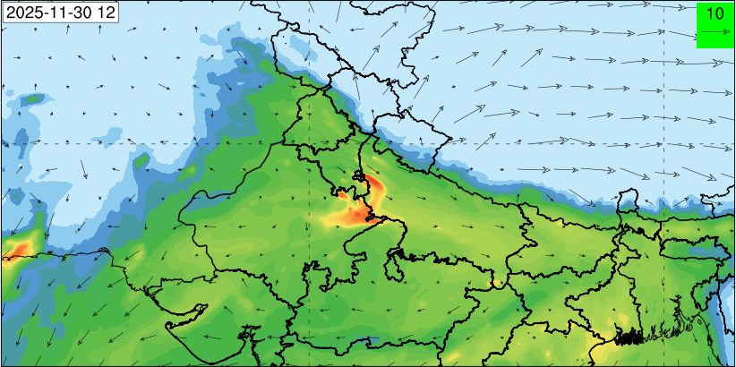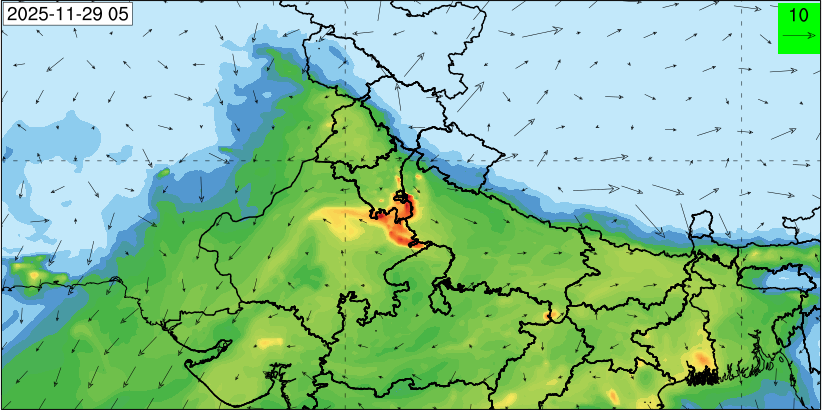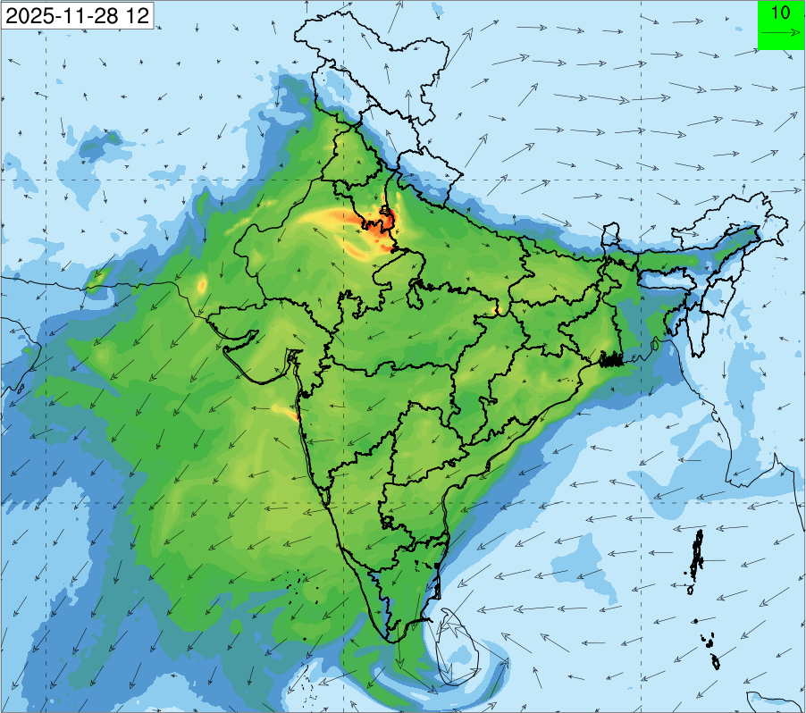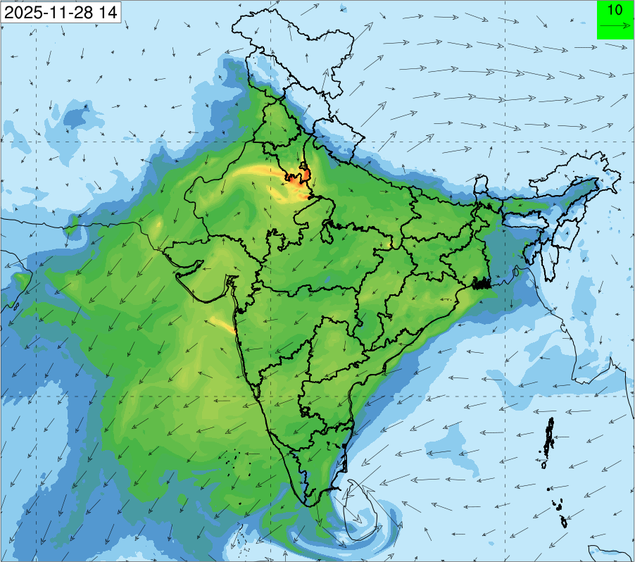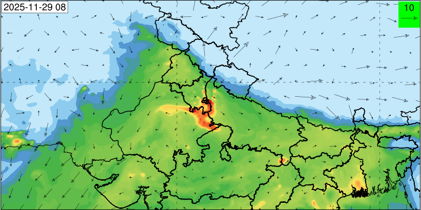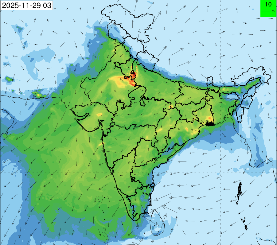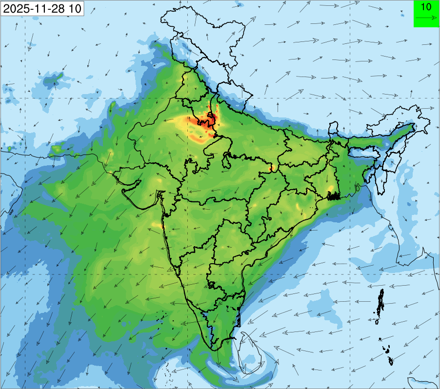 3. Predicted maximum mixing depth is likely to be 1050 m on 28.11.2025, 1450 m on 29.11.2025, 1000 m on 30.11.2025, and 1100 m on 01.12.2025 over Delhi. Ventilation index is likely to be 4500 m2/s on 28.11.2025, 8500 m2/s on 29.11.2025, 6000 m2/s on 30.11.2025 and 4500 m2/s on 01.12.2025 over Delhi. The ventilation index lower than 6000 m2/s with average wind speed less than 10 kmph is unfavourable for dispersion of pollutants.