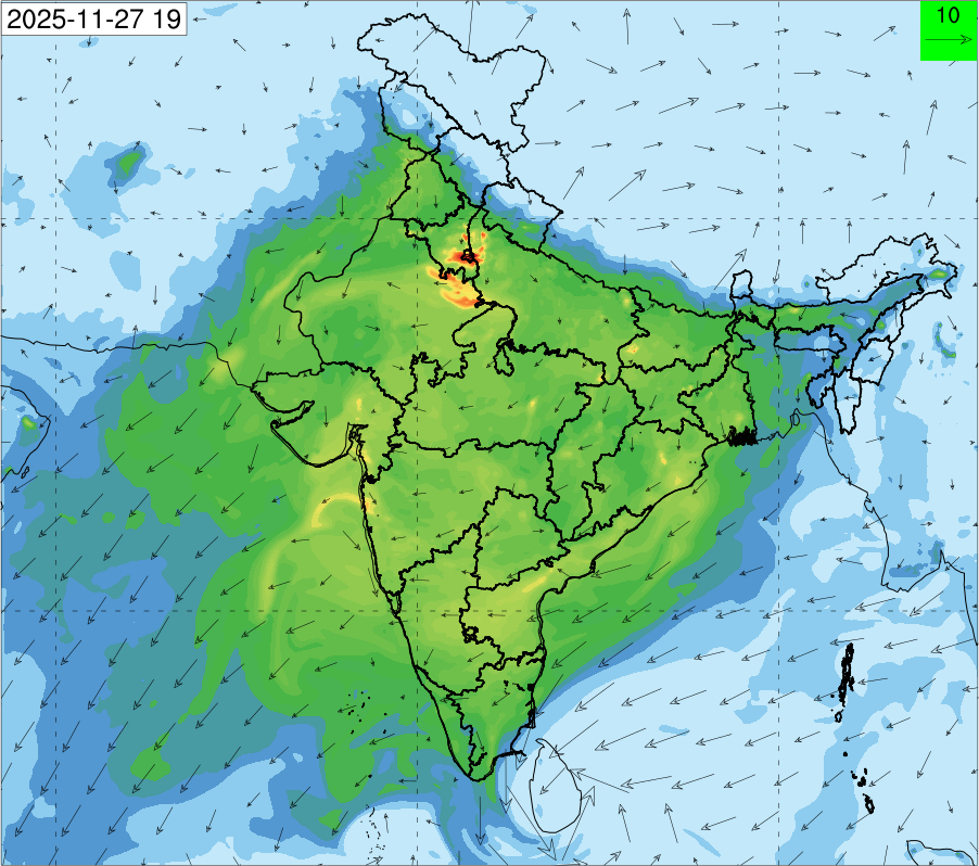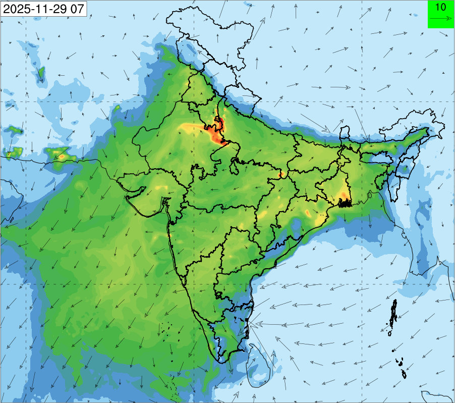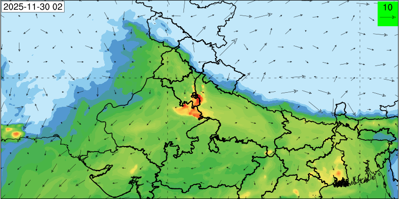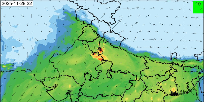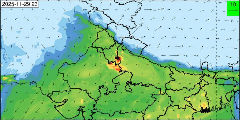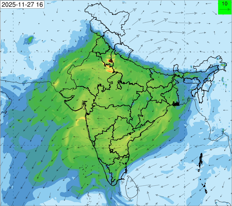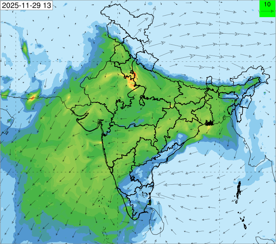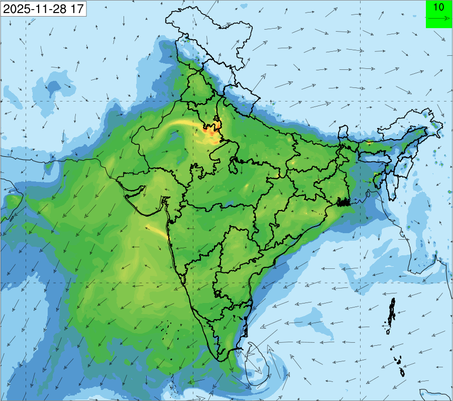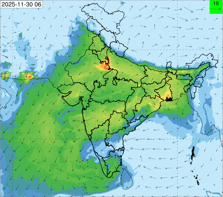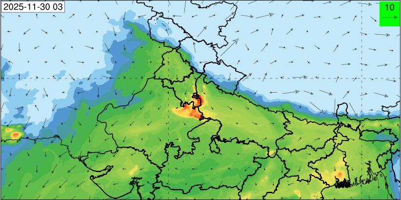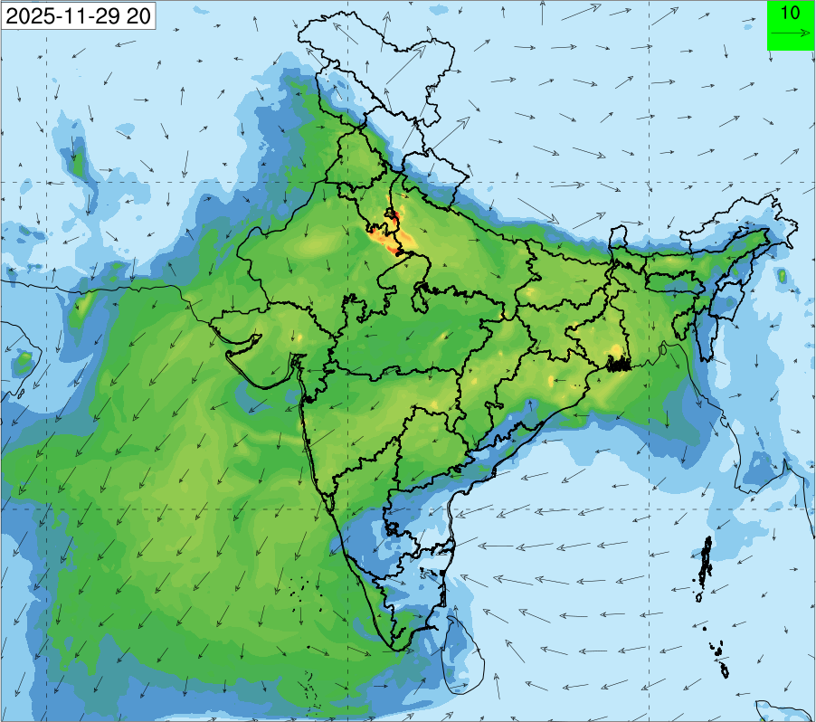 3. Predicted maximum mixing depth is likely to be 1050 m on 28.11.2025, 1450 m on 29.11.2025, 1000 m on 30.11.2025, and 1100 m on 01.12.2025 over Delhi. Ventilation index is likely to be 4500 m2/s on 28.11.2025, 8500 m2/s on 29.11.2025, 6000 m2/s on 30.11.2025 and 4500 m2/s on 01.12.2025 over Delhi. The ventilation index lower than 6000 m2/s with average wind speed less than 10 kmph is unfavourable for dispersion of pollutants.