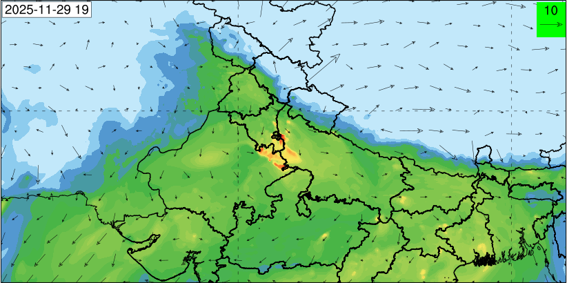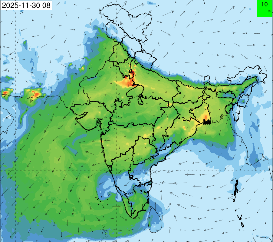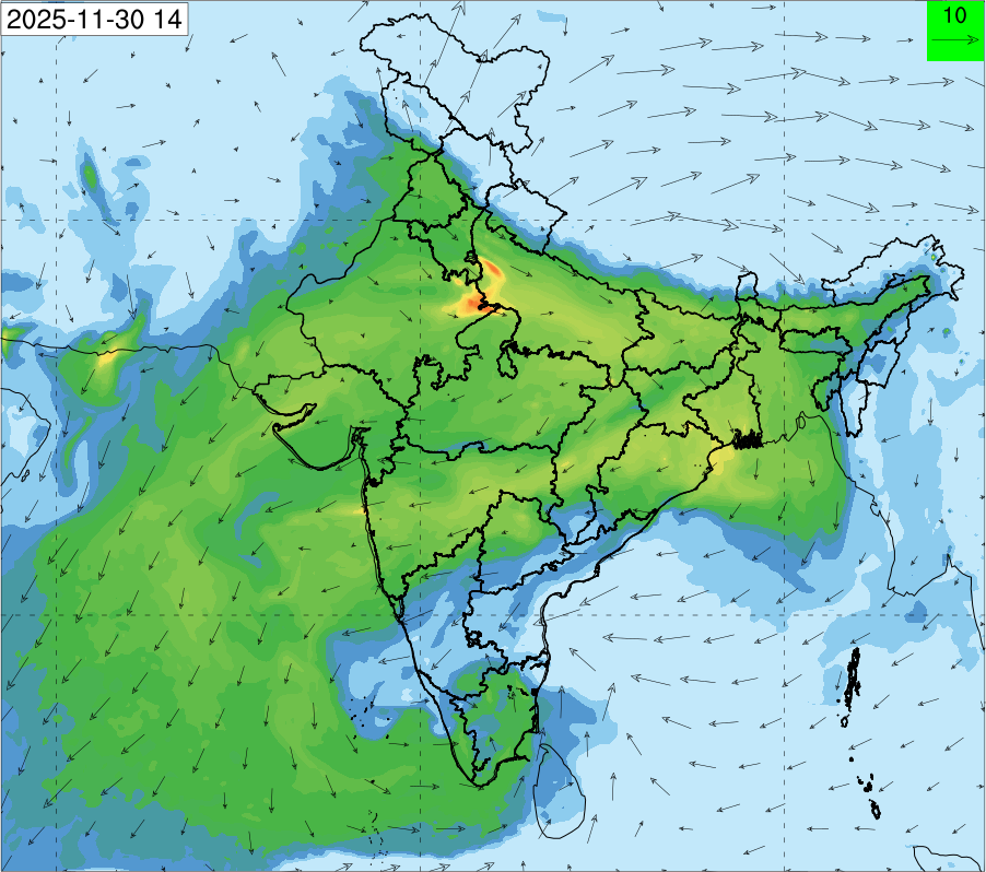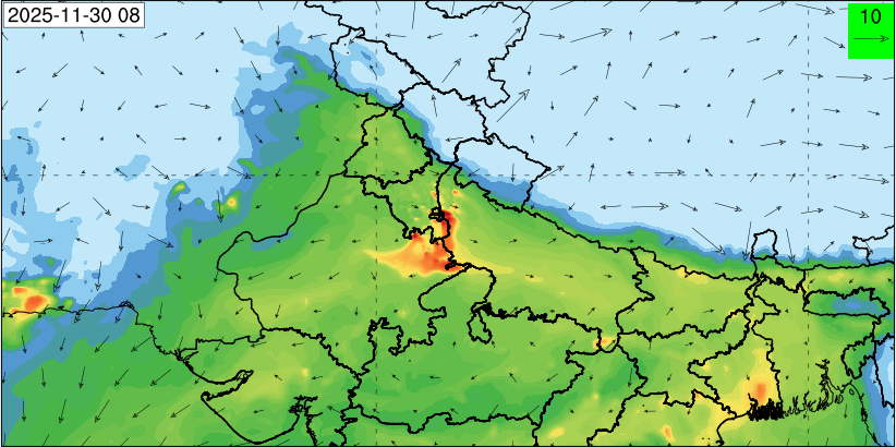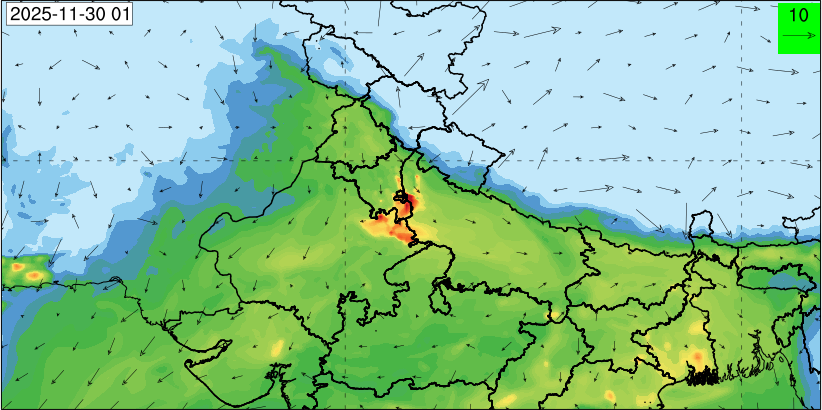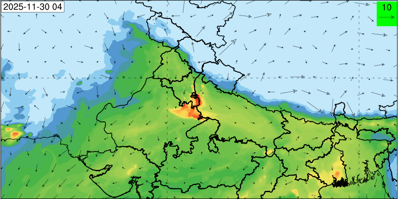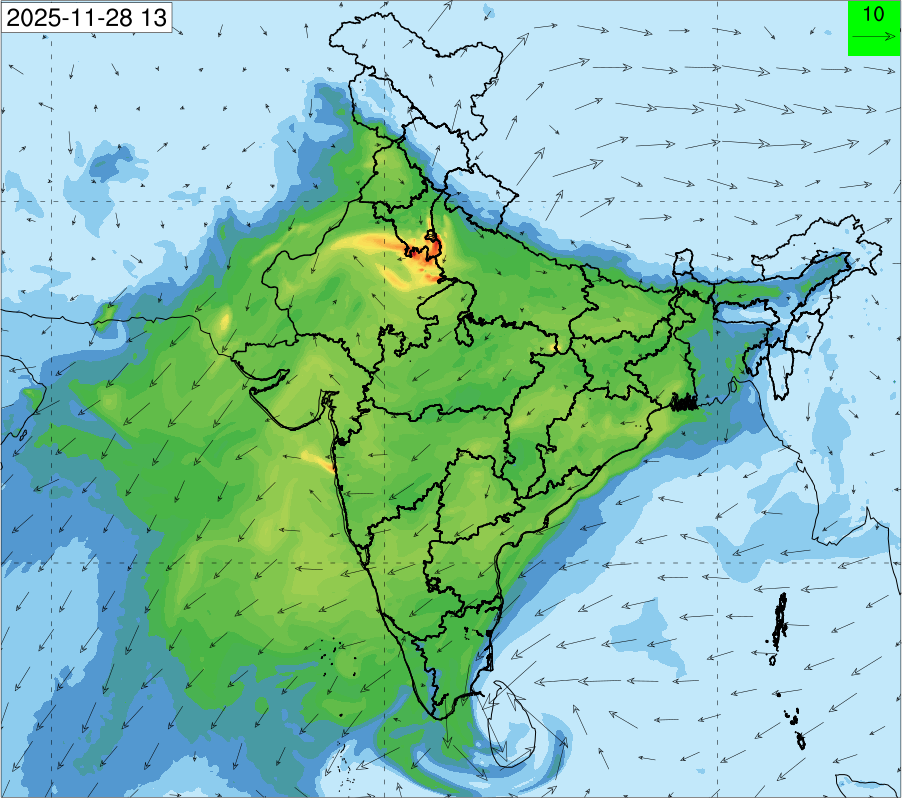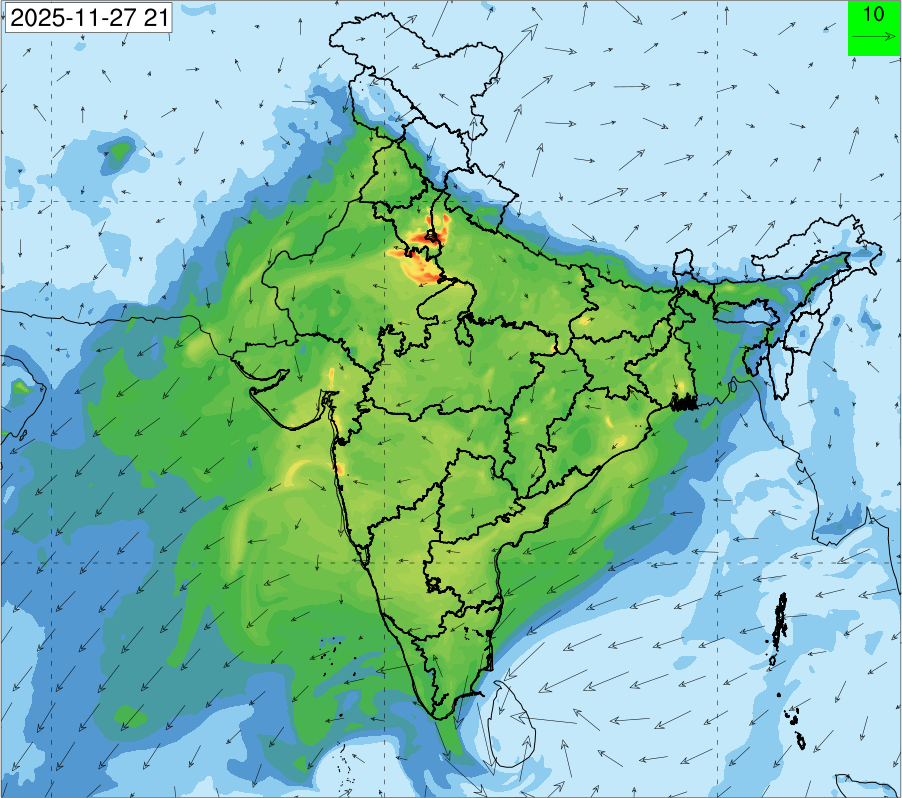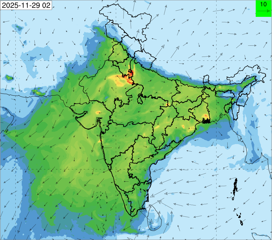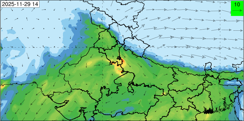 3. Predicted maximum mixing depth is likely to be 1050 m on 28.11.2025, 1450 m on 29.11.2025, 1000 m on 30.11.2025, and 1100 m on 01.12.2025 over Delhi. Ventilation index is likely to be 4500 m2/s on 28.11.2025, 8500 m2/s on 29.11.2025, 6000 m2/s on 30.11.2025 and 4500 m2/s on 01.12.2025 over Delhi. The ventilation index lower than 6000 m2/s with average wind speed less than 10 kmph is unfavourable for dispersion of pollutants.
