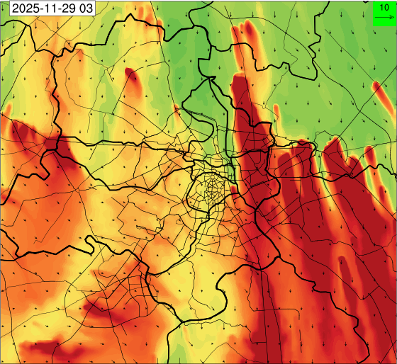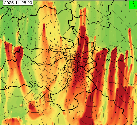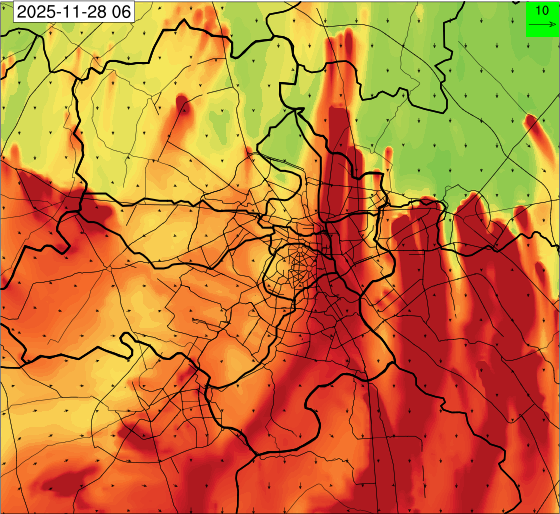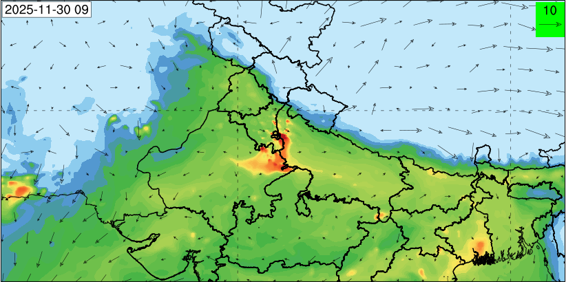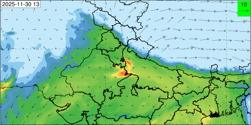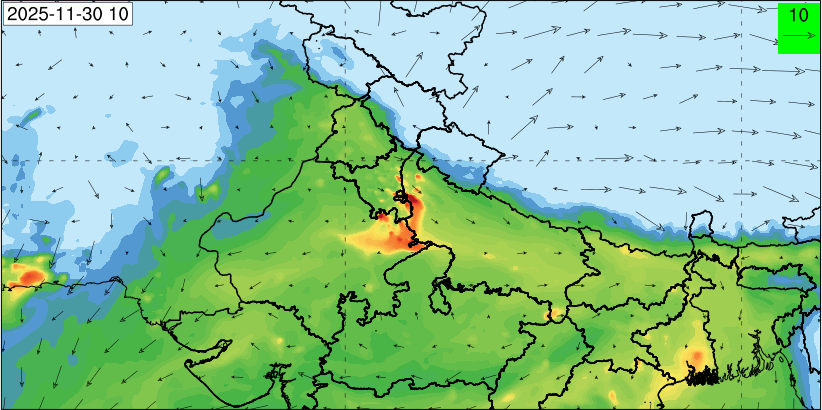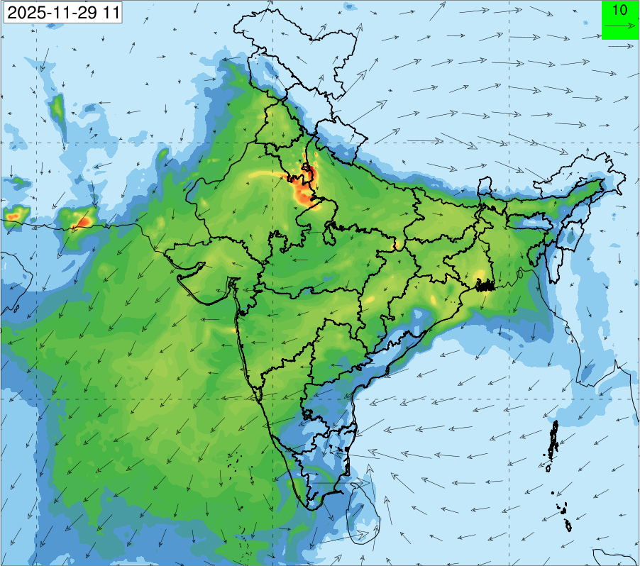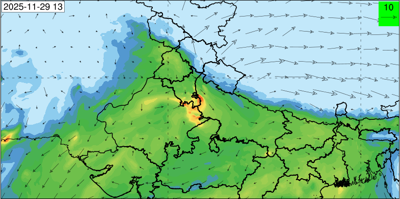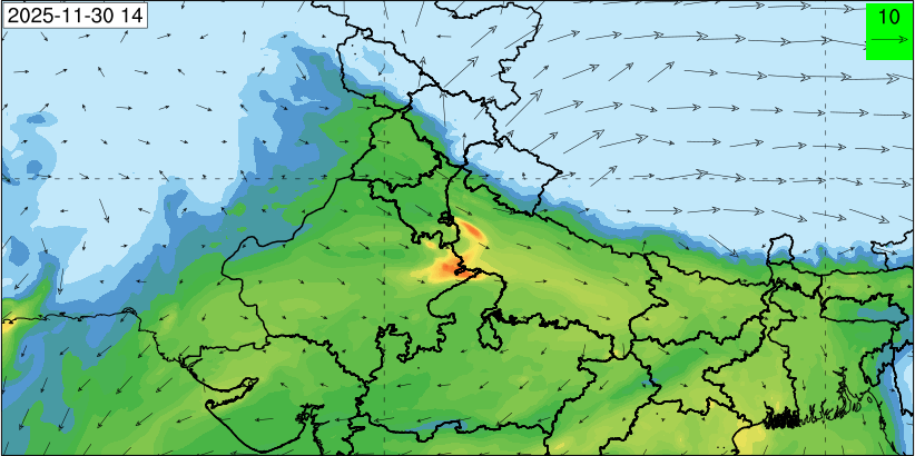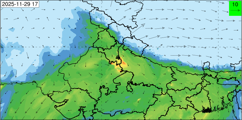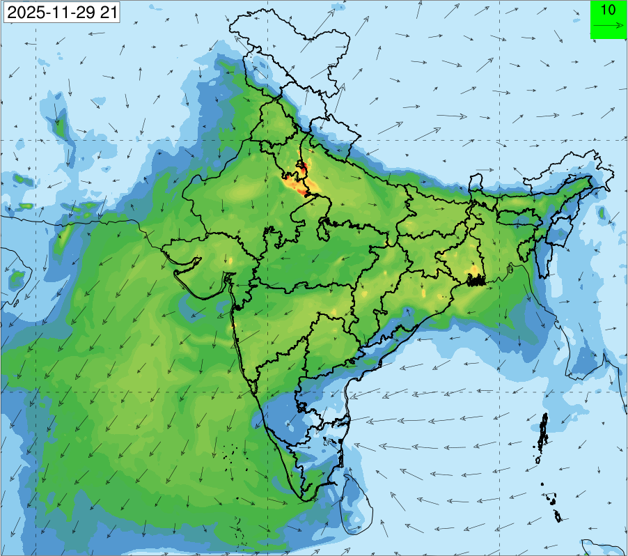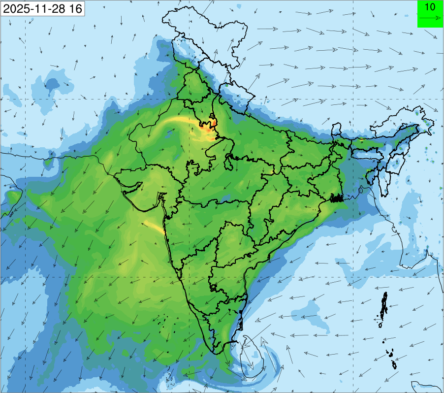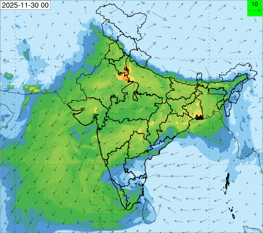 3. Predicted maximum mixing depth is likely to be 1050 m on 28.11.2025, 1450 m on 29.11.2025, 1000 m on 30.11.2025, and 1100 m on 01.12.2025 over Delhi. Ventilation index is likely to be 4500 m2/s on 28.11.2025, 8500 m2/s on 29.11.2025, 6000 m2/s on 30.11.2025 and 4500 m2/s on 01.12.2025 over Delhi. The ventilation index lower than 6000 m2/s with average wind speed less than 10 kmph is unfavourable for dispersion of pollutants.