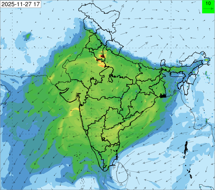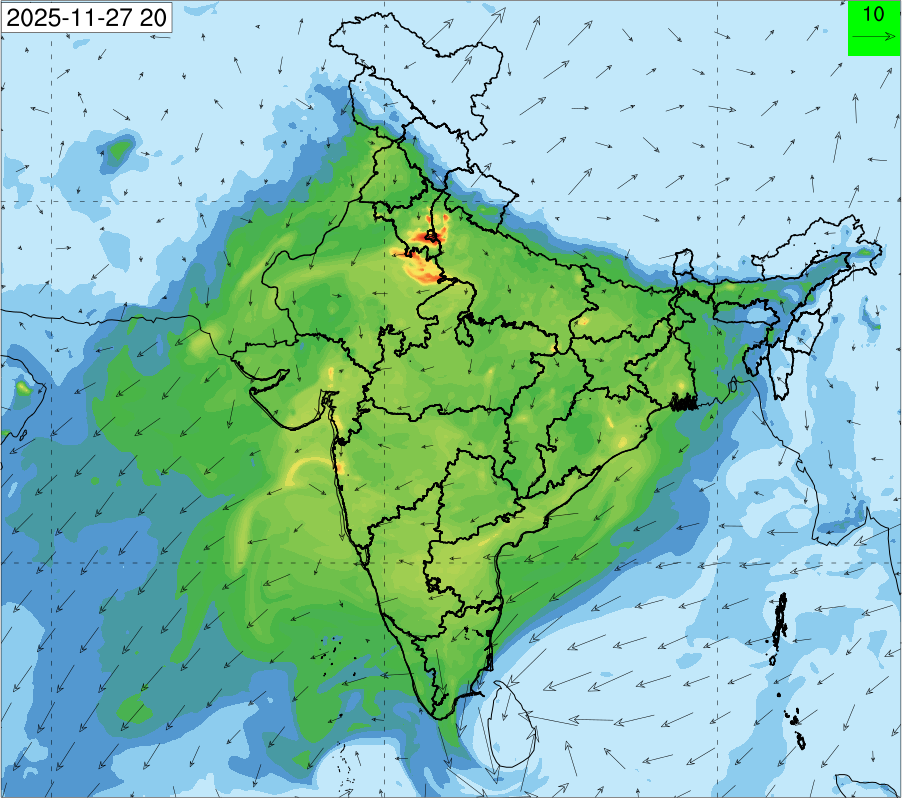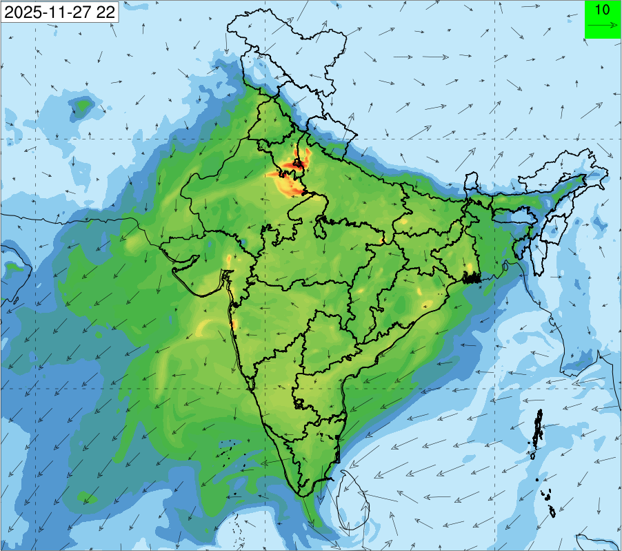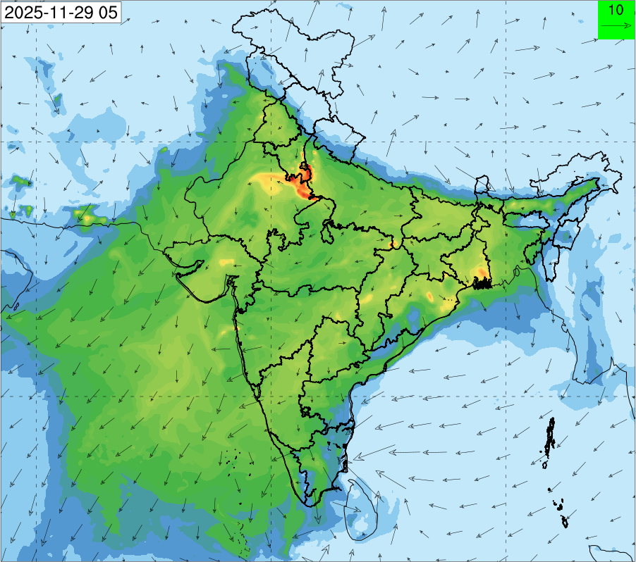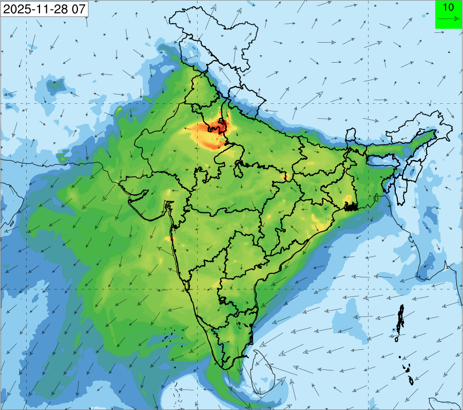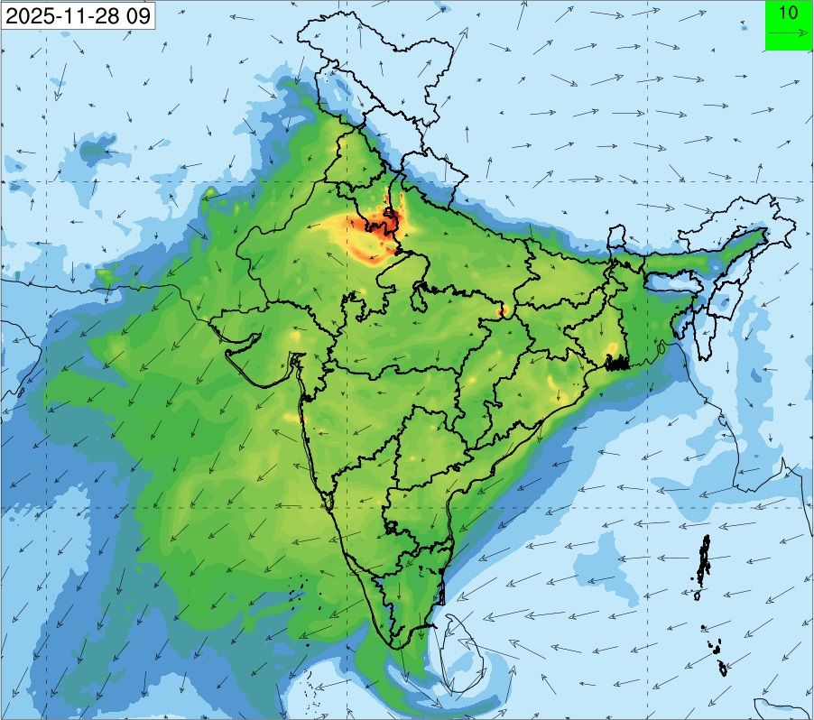 1. Past Weather and Air Quality Observation: The air quality over Delhi was in Very poor category with CPCB AQI 377 at 4 PM on 27.11.2025. No significant change in maximum temperatures and minimum temperatures during the past 24 hours over Delhi. Shallow fog occurred at isolated places over Delhi. The maximum and minimum temperatures over Delhi were around 23 to 26 °C and 08 to 10°C, respectively. The minimum temperatures are appreciably below normal (-3.1 to -5.0 °C) at a few places and below normal (-1.6 to -3.0) at isolated places and normal (-1.5 to 1.5) over the remaining parts of Delhi. The maximum temperatures were below normal (-1.6 to -3.0 °C) at isolated places and normal (-1.5 to 1.5°C) at many places over Delhi. Smoke was reported at Safdarjung and Palam Airports. Safdarjung airport recorded the lowest visibility of 500m from 0730 Hrs IST to 0800 Hrs IST on 28.11.2025, which thereafter improved, becoming 600m at 0800 Hrs IST. Palam airport recorded the lowest visibility of 600m from 0830 Hrs IST to 0900 Hrs IST on 28.11.2025, which thereafter improved, becoming 700m at 0930 Hrs IST. Mainly clear sky conditions with predominant surface wind from the northeast direction, with a wind speed up to 09 kmph, prevailed during the past 24 hours. Mainly clear sky conditions with wind from the southwest direction with a wind speed up to 09 kmph in early morning hours, gradually increasing up to 10 kmph from the northwest direction prevailed over the region in the forenoon today.