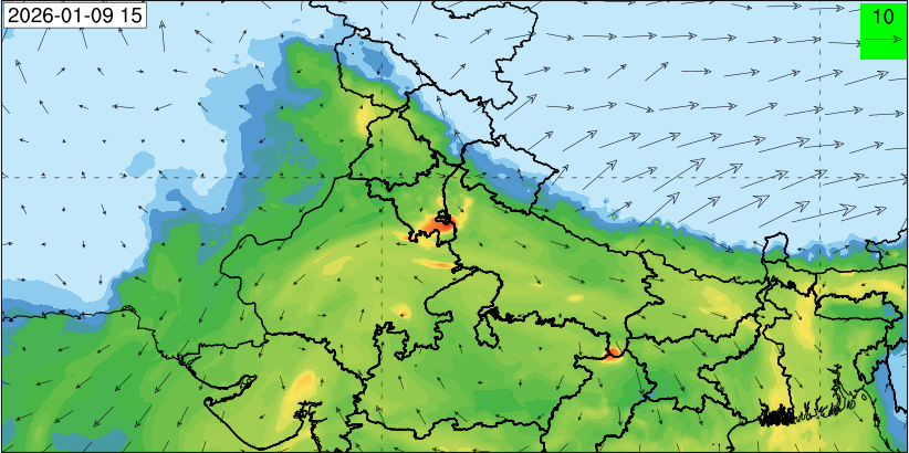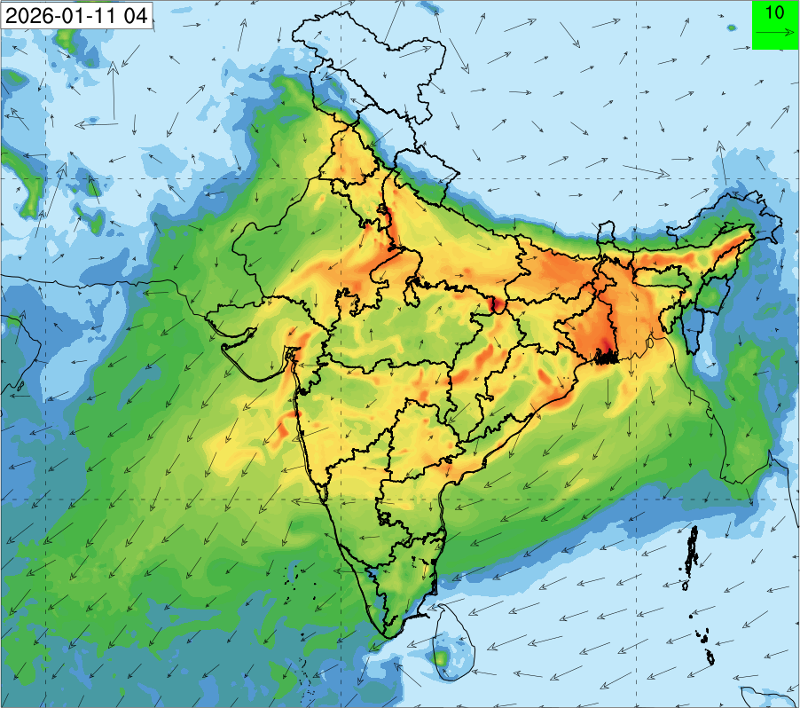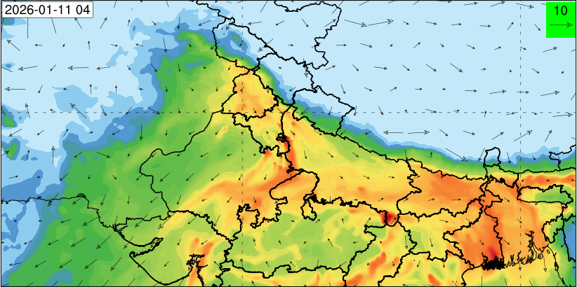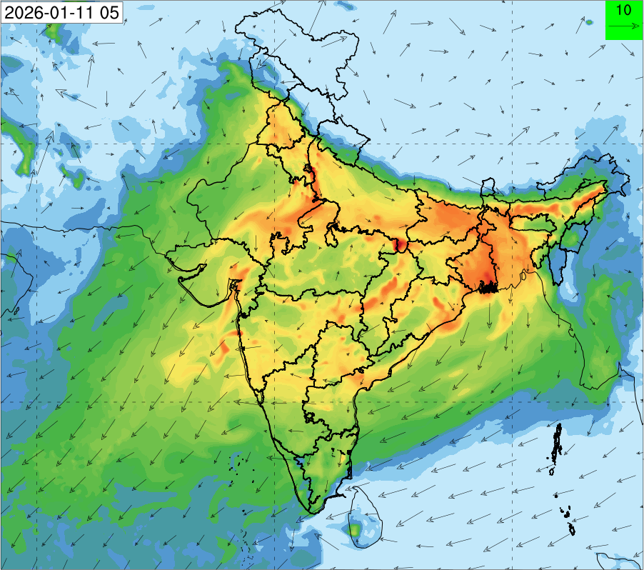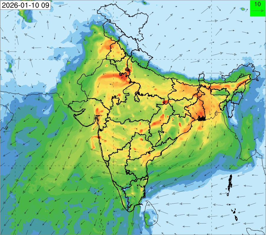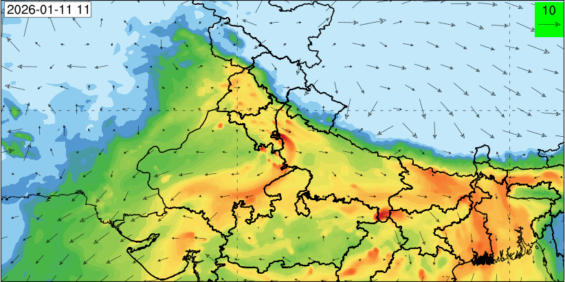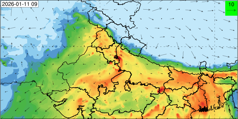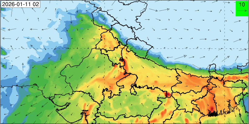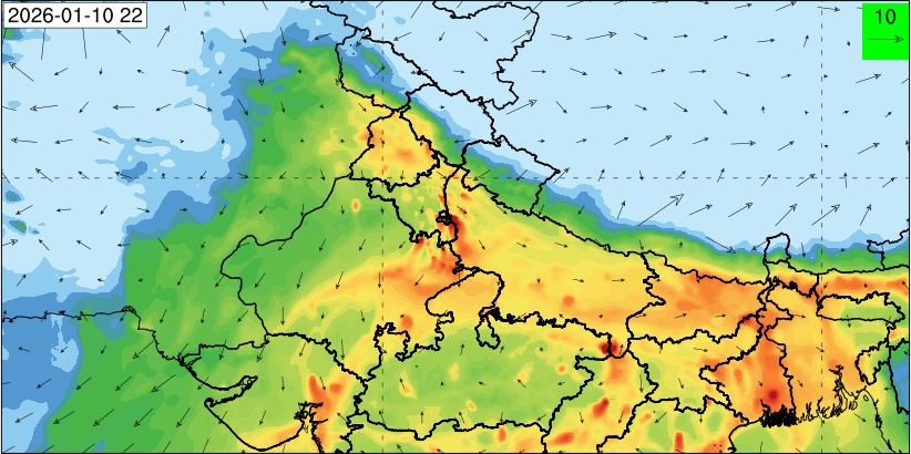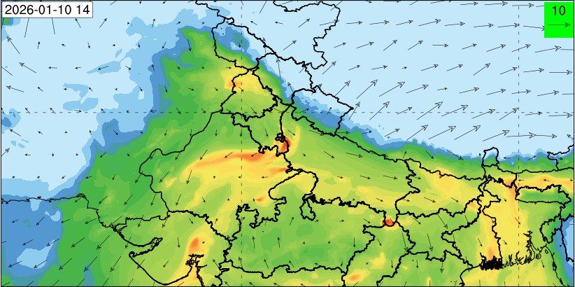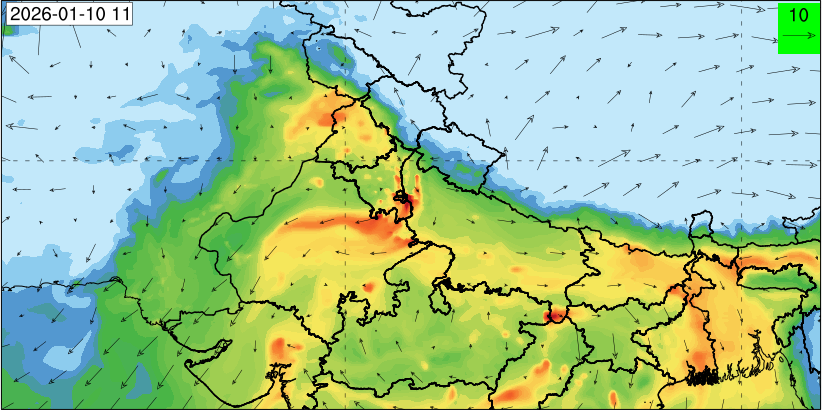 3. Predicted maximum mixing depth is likely to be 1100 m on 10.12.2025, 1000 m on 11.12.2025, 800 m on 12.12.2025, and 900 m on 13.12.2025 over Delhi. Ventilation index is likely to be 6500 m2/s on 10.12.2025, 4000 m2/s on 11.12.2025, 800 m2/s on 12.12.2025 and 800 m2/s on 13.12.2025 over Delhi. The ventilation index lower than 6000 m2/s with average wind speed less than 10 kmph is unfavourable for dispersion of pollutants.
