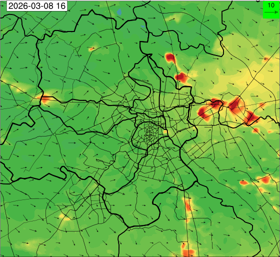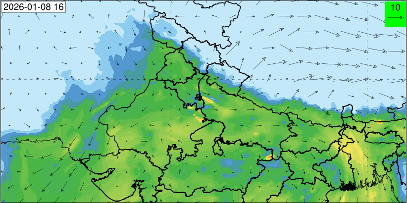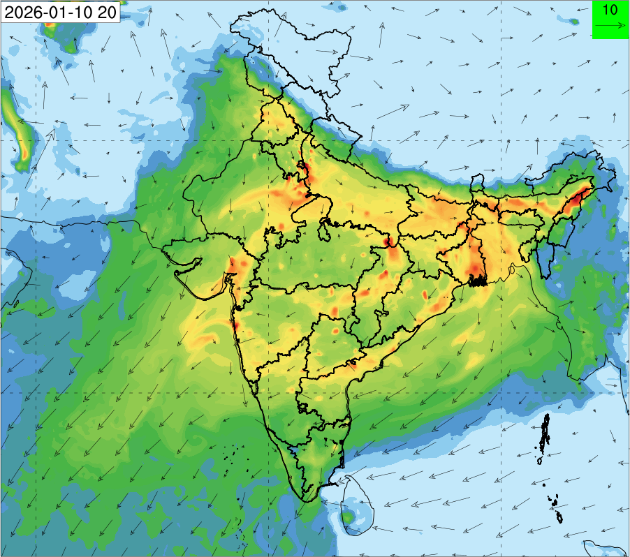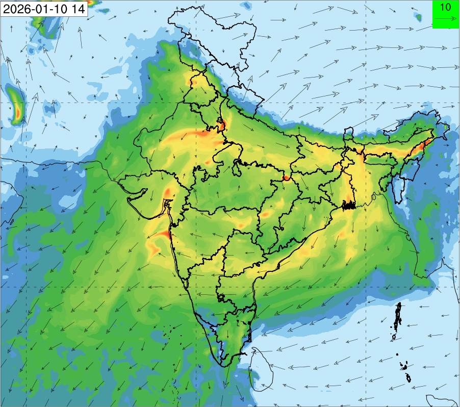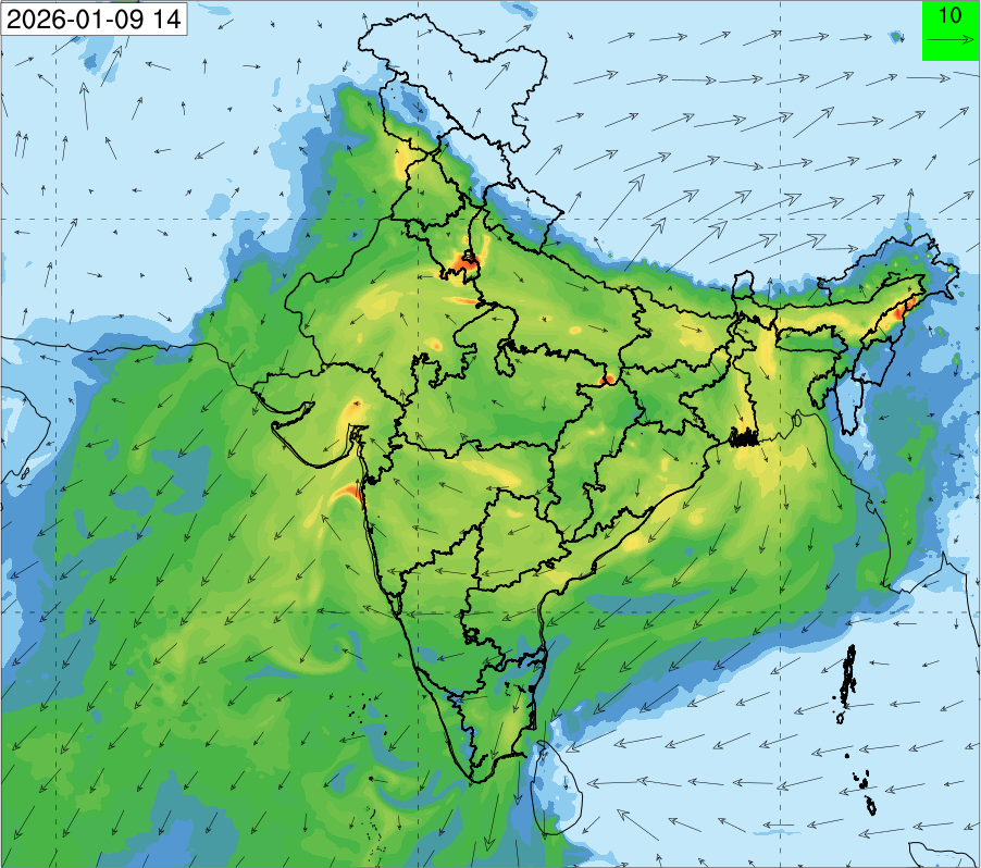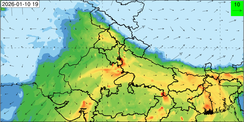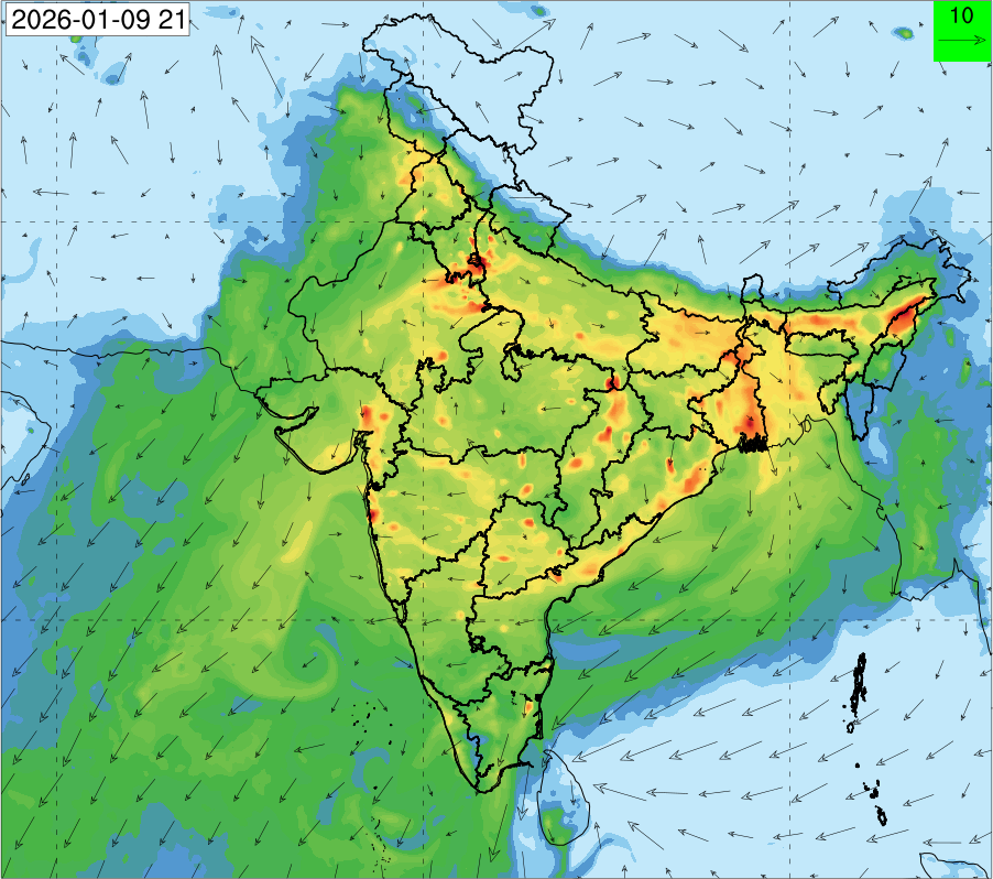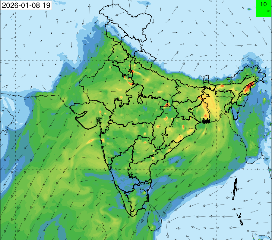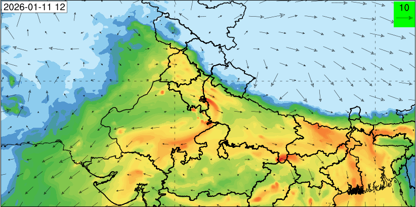 3. Predicted maximum mixing depth is likely to be 1100 m on 10.12.2025, 1000 m on 11.12.2025, 800 m on 12.12.2025, and 900 m on 13.12.2025 over Delhi. Ventilation index is likely to be 6500 m2/s on 10.12.2025, 4000 m2/s on 11.12.2025, 800 m2/s on 12.12.2025 and 800 m2/s on 13.12.2025 over Delhi. The ventilation index lower than 6000 m2/s with average wind speed less than 10 kmph is unfavourable for dispersion of pollutants.