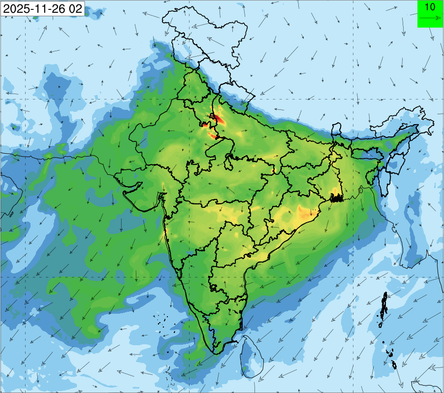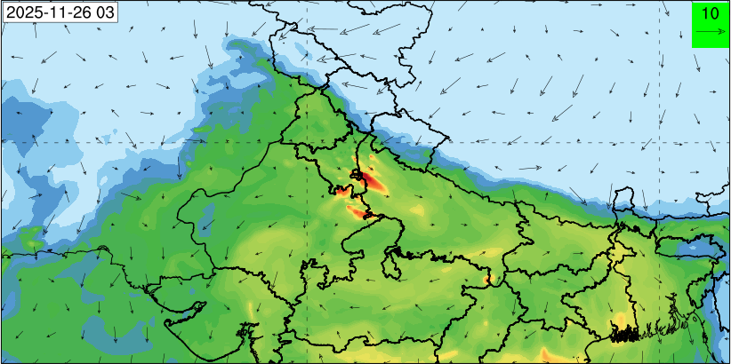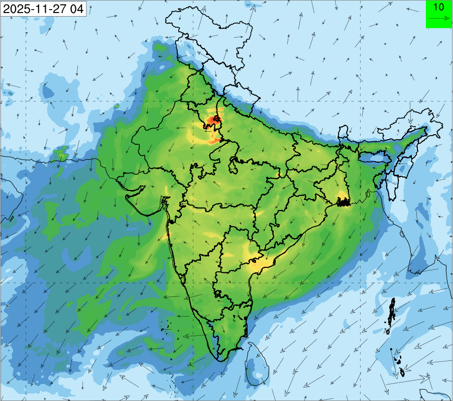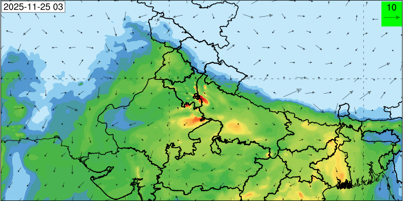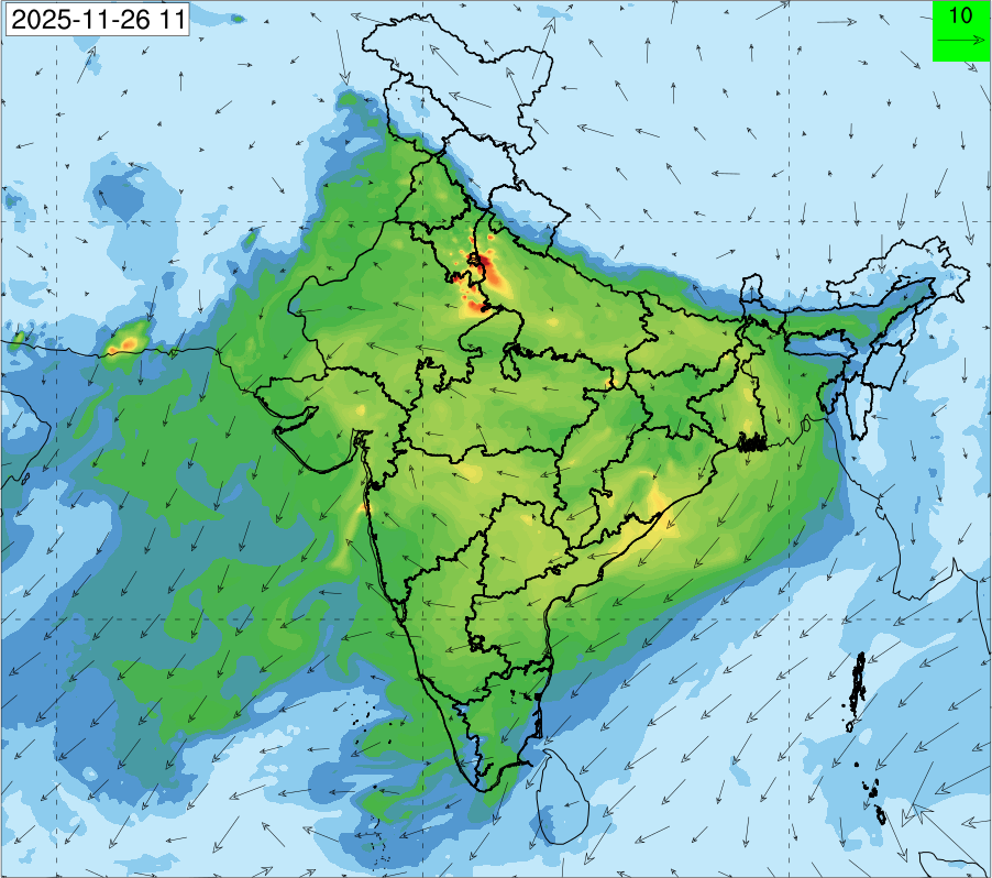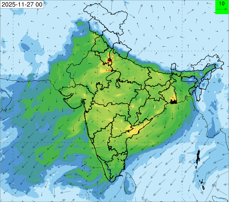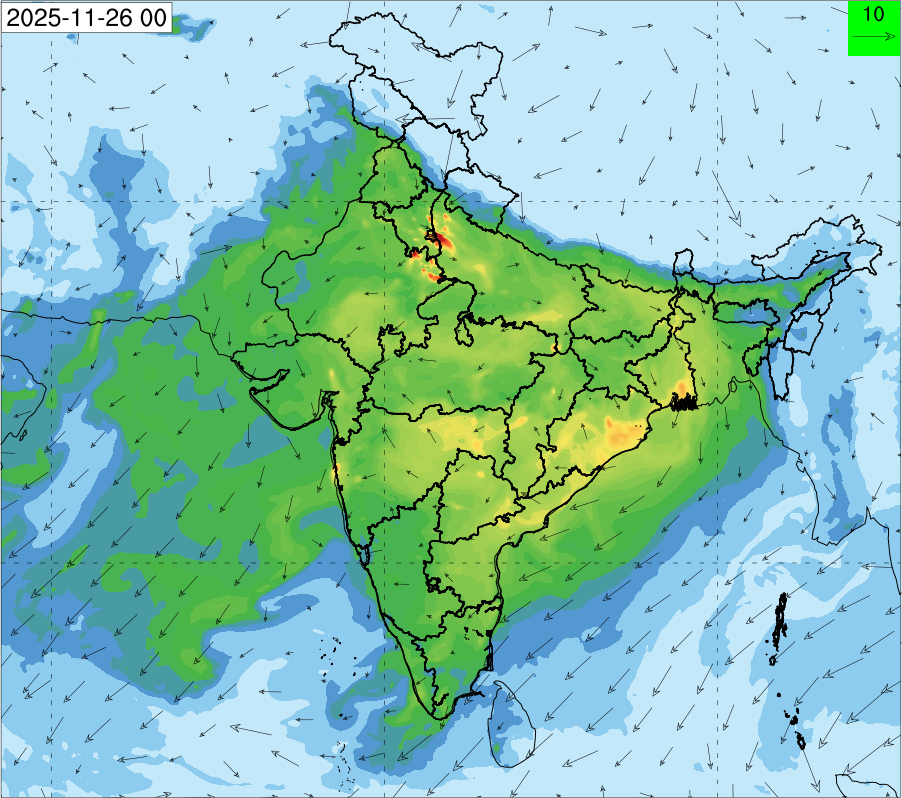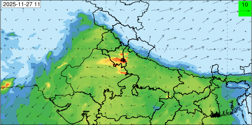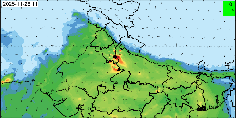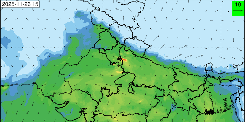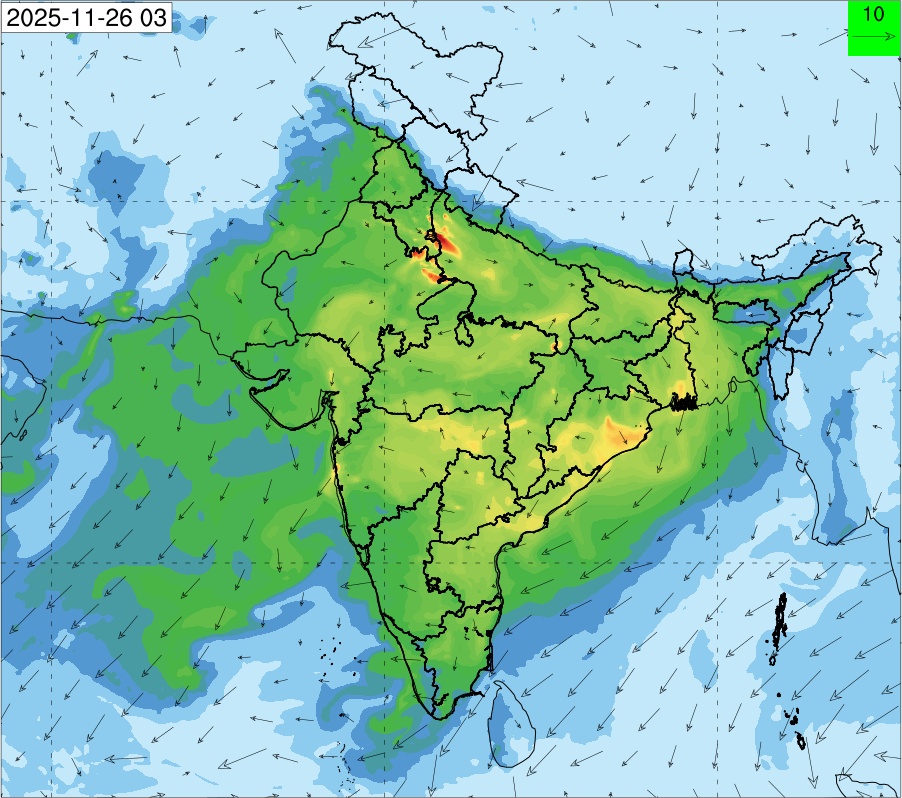 3. Predicted maximum mixing depth is likely to be 1200 m on 26.11.2025, 1000 m on 27.11.2025, 1200 m on 28.11.2025, and 1250 m on 29.11.2025 over Delhi. Ventilation index is likely to be 3500 m2/s on 26.11.2025, 2000 m2/s on 27.11.2025, 7000 m2/s on 28.11.2025 and 6500 m2/s on 29.11.2025 over Delhi. The ventilation index lower than 6000 m2/s with average wind speed less than 10 kmph is unfavourable for dispersion of pollutants.