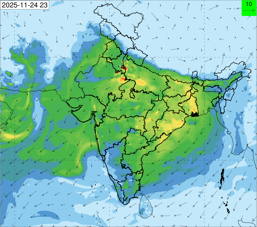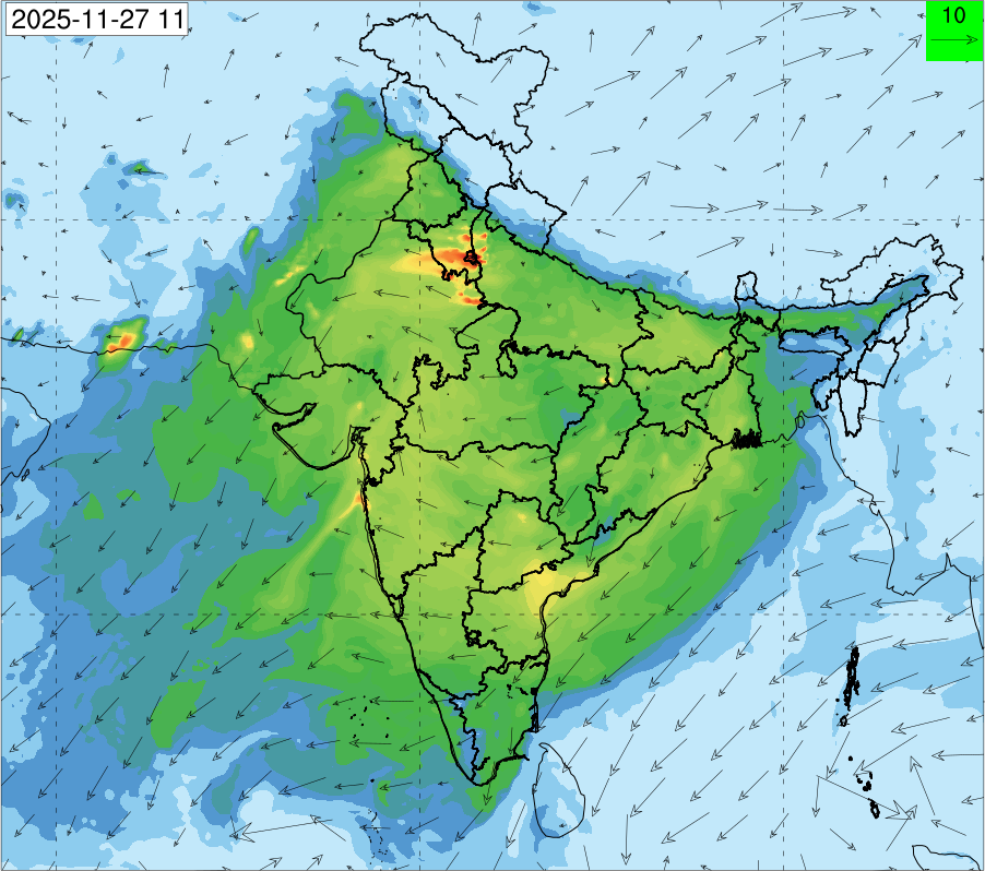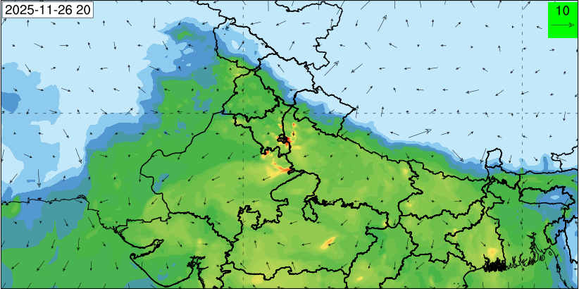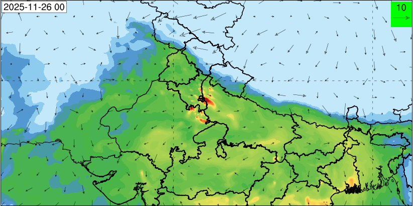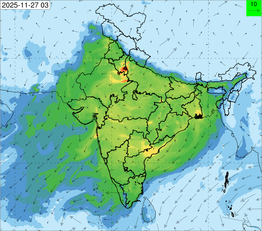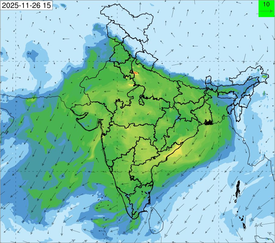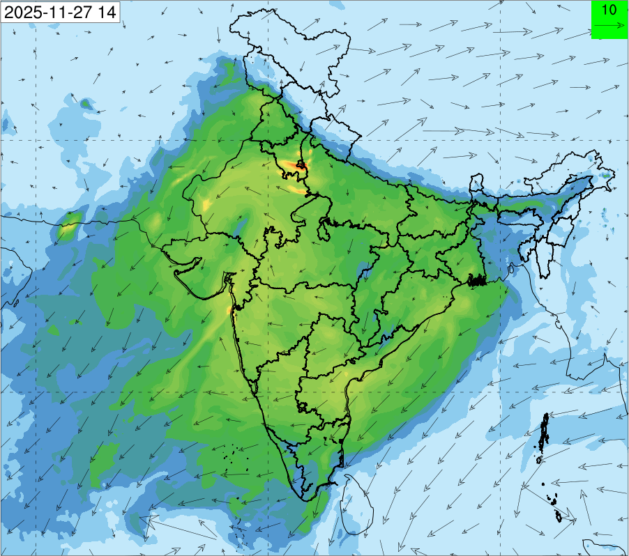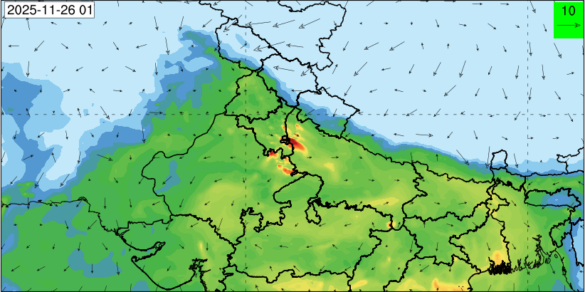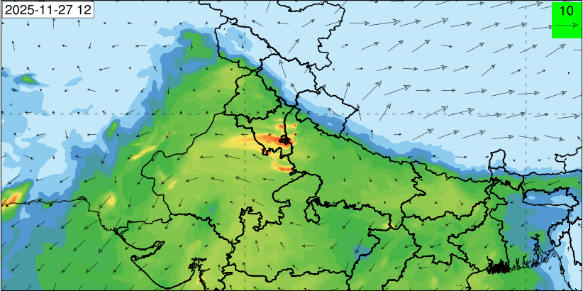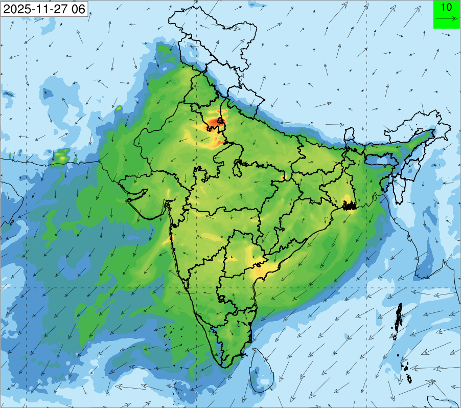 3. Predicted maximum mixing depth is likely to be 1200 m on 26.11.2025, 1000 m on 27.11.2025, 1200 m on 28.11.2025, and 1250 m on 29.11.2025 over Delhi. Ventilation index is likely to be 3500 m2/s on 26.11.2025, 2000 m2/s on 27.11.2025, 7000 m2/s on 28.11.2025 and 6500 m2/s on 29.11.2025 over Delhi. The ventilation index lower than 6000 m2/s with average wind speed less than 10 kmph is unfavourable for dispersion of pollutants.