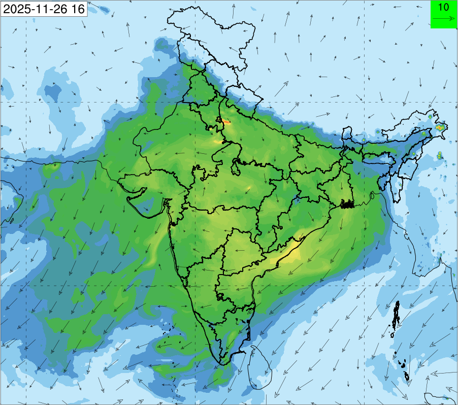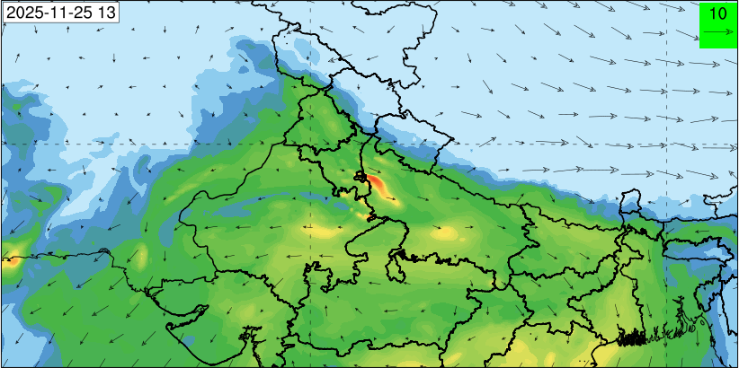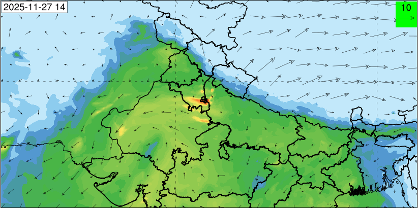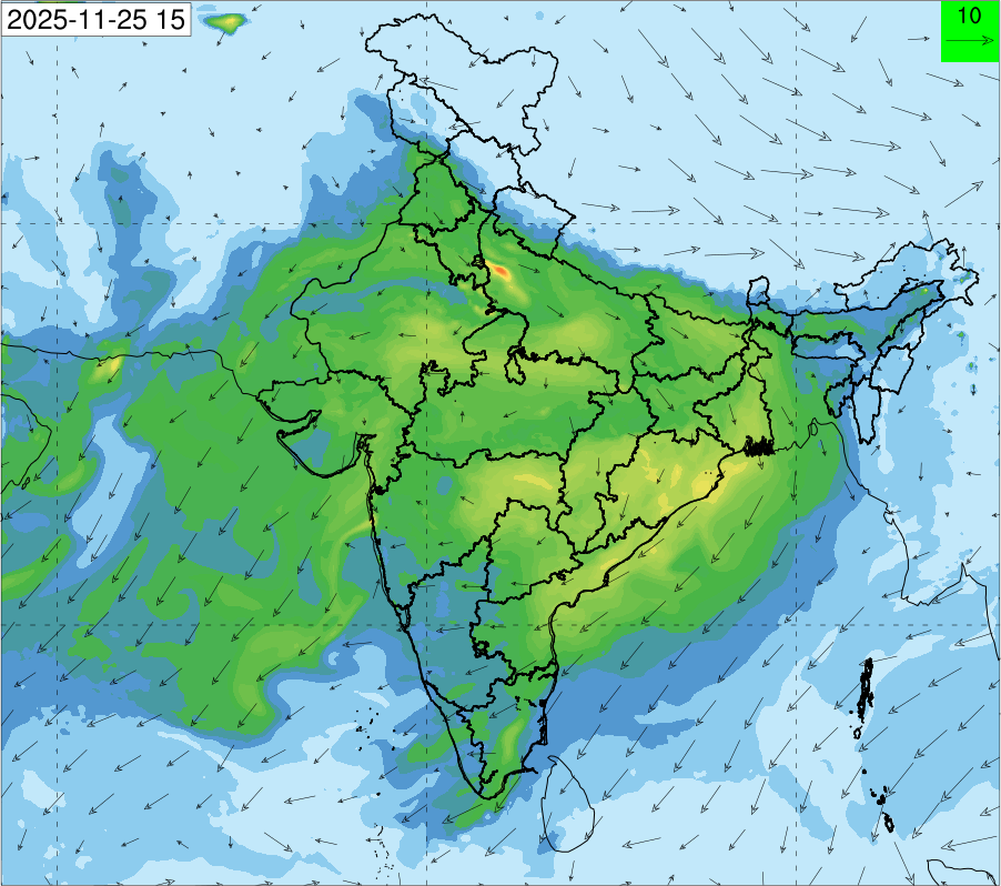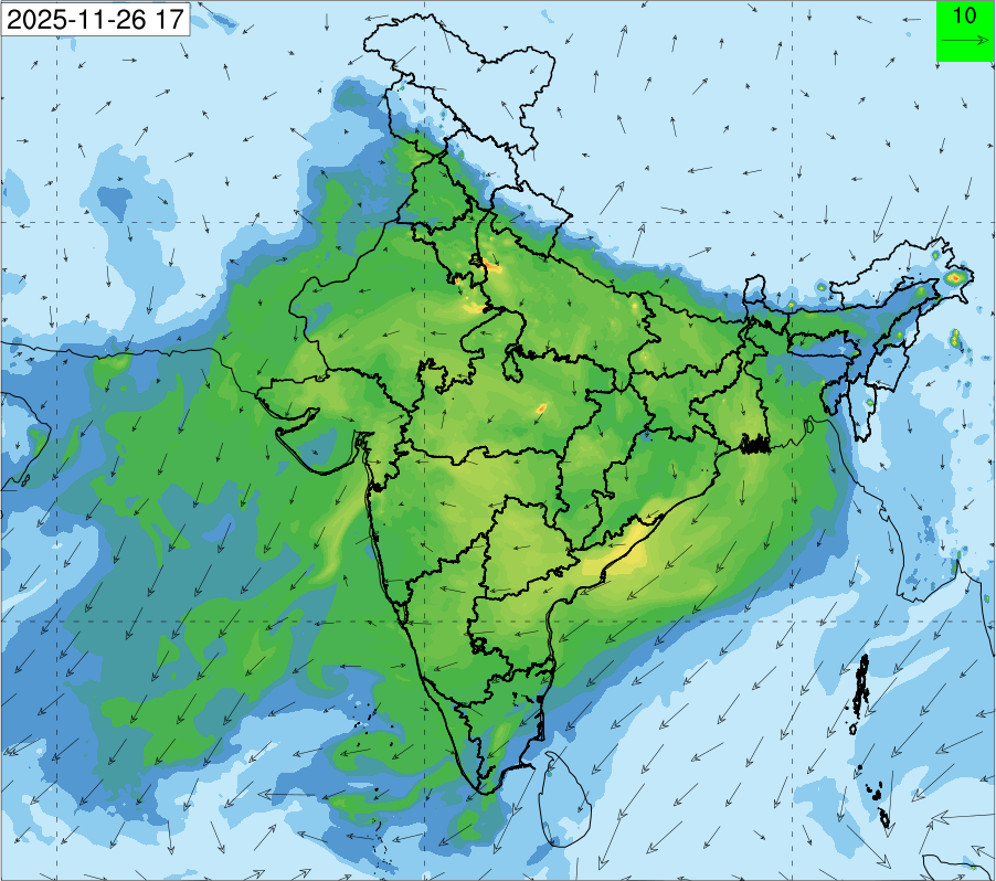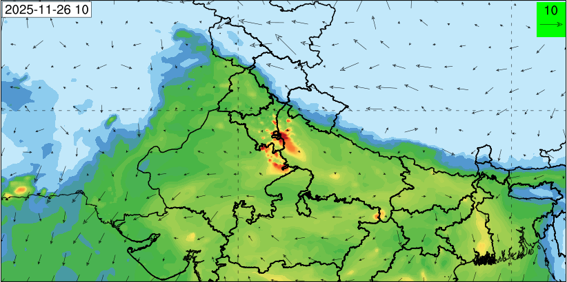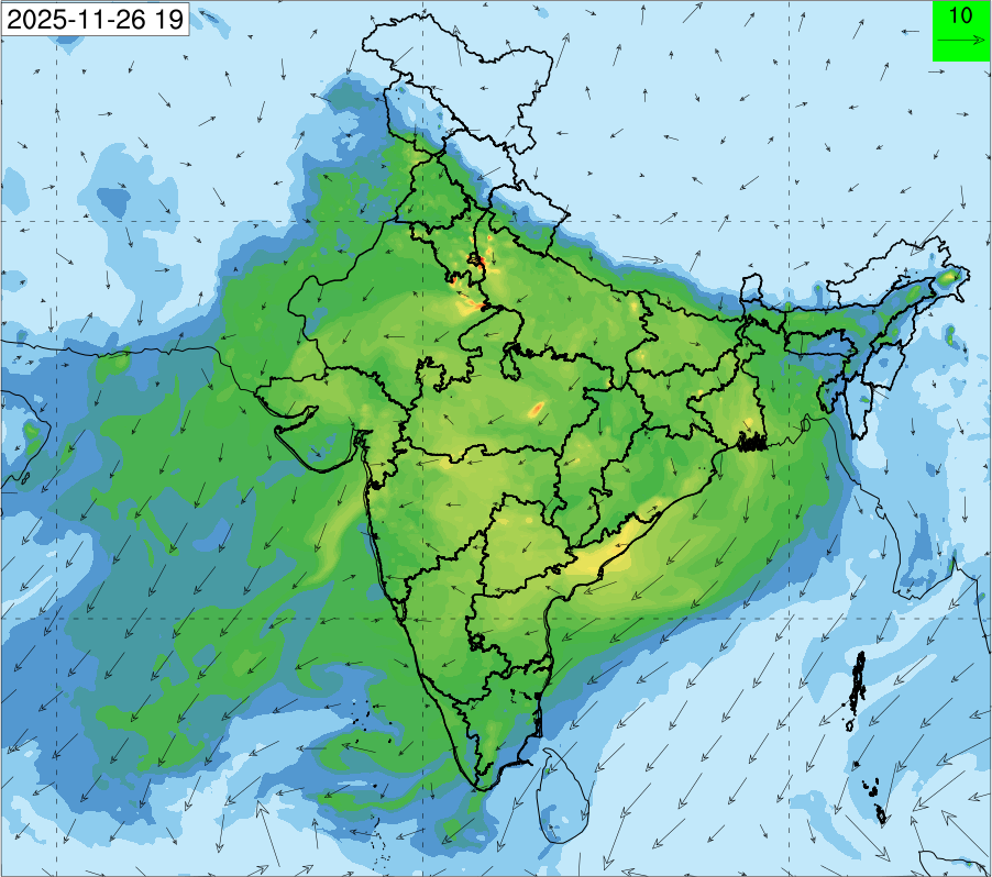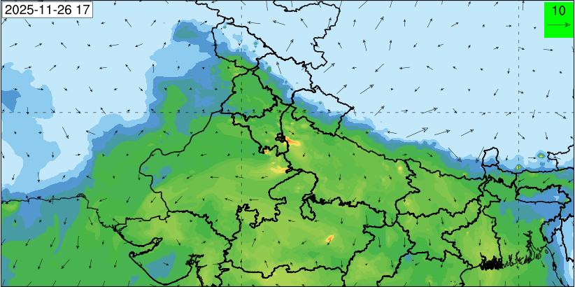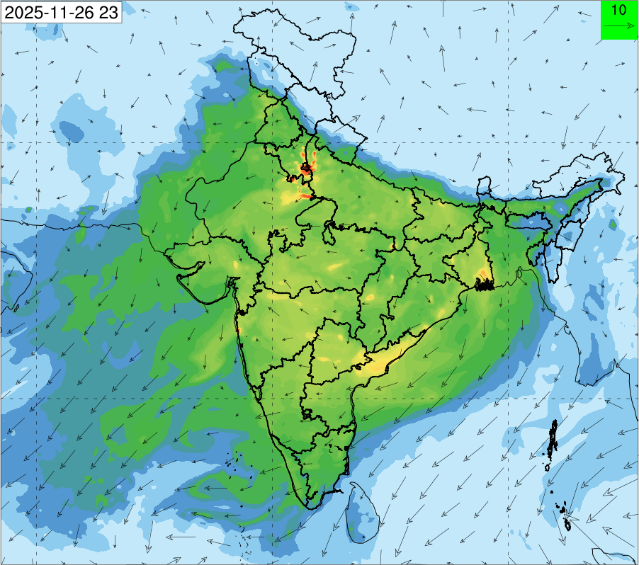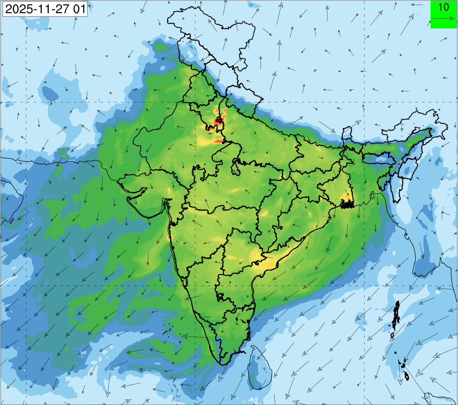 3. Predicted maximum mixing depth is likely to be 1200 m on 26.11.2025, 1000 m on 27.11.2025, 1200 m on 28.11.2025, and 1250 m on 29.11.2025 over Delhi. Ventilation index is likely to be 3500 m2/s on 26.11.2025, 2000 m2/s on 27.11.2025, 7000 m2/s on 28.11.2025 and 6500 m2/s on 29.11.2025 over Delhi. The ventilation index lower than 6000 m2/s with average wind speed less than 10 kmph is unfavourable for dispersion of pollutants.