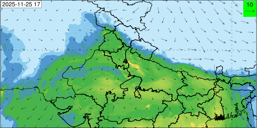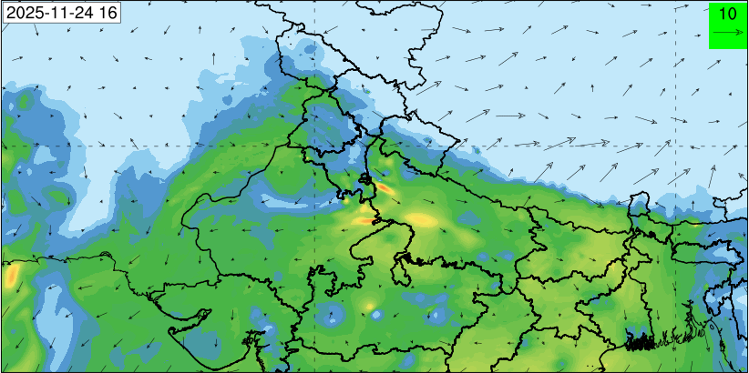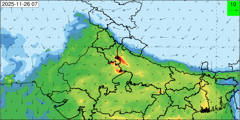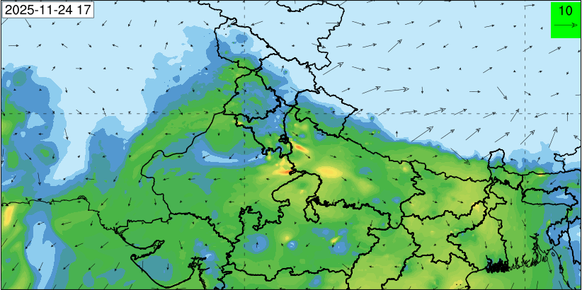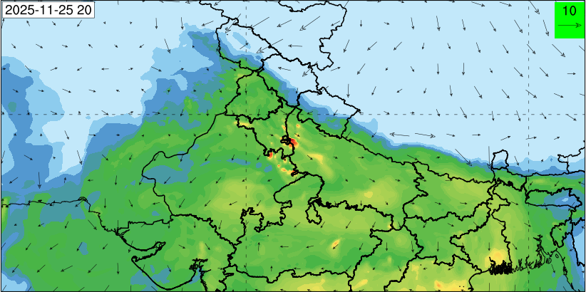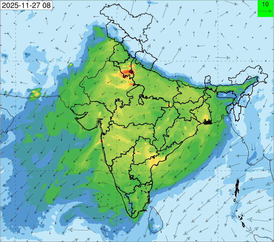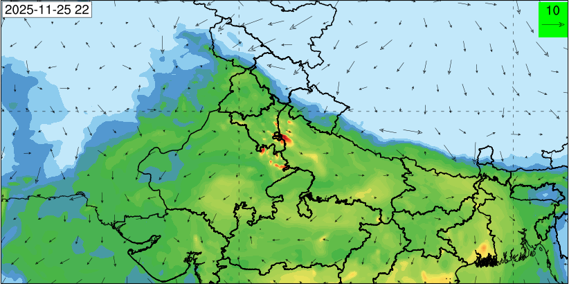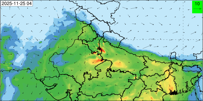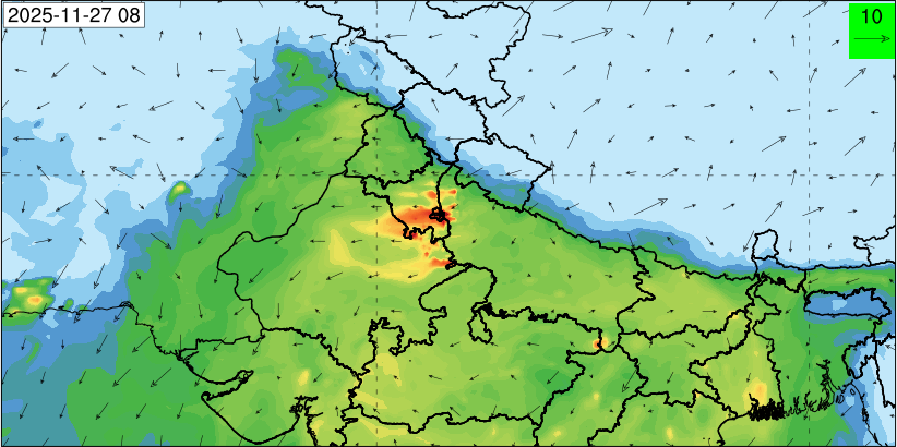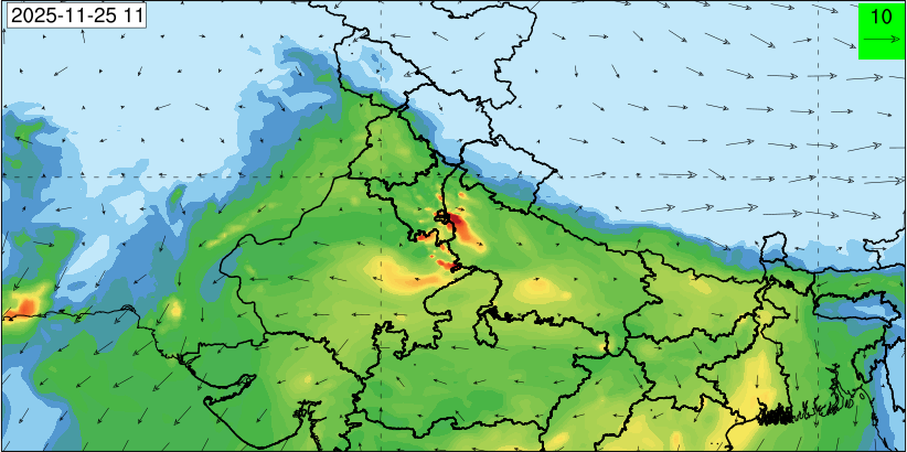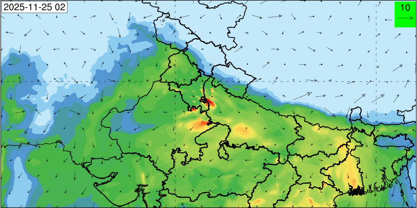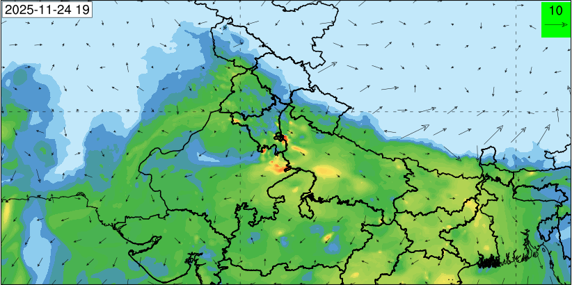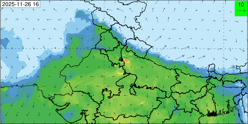 1. Past Weather and Air Quality Observation: The air quality over Delhi was in Very poor category with CPCB AQI 353 at 4 PM on 25.11.2025. There has been a slight fall in minimum and maximum temperatures by 01°C during the past 24 hours over Delhi. The maximum and minimum temperatures over Delhi were around 24 to 26 °C and 07 to 10°C, respectively. The minimum temperatures are appreciably below normal (-3.3 to 5.1°C) at most places and below normal (-1.6 to -2.5 °C) at many places in Delhi. The maximum temperatures are appreciably below normal (-3.1 to 5.0°C) at isolated places and below normal (-1.6 to -3.0 °C) at many places and normal (-1.5 to 1.5°C) at a few places over Delhi. Smoke was reported at Palam Airport. Mainly clear sky conditions with predominant surface wind from the west direction with a wind speed up to 12 kmph prevailed during the past 24 hours. Mainly clear sky conditions with calm wind in early morning hours, gradually increasing up to 06 kmph from the southwest direction prevailed over the region in the forenoon today.