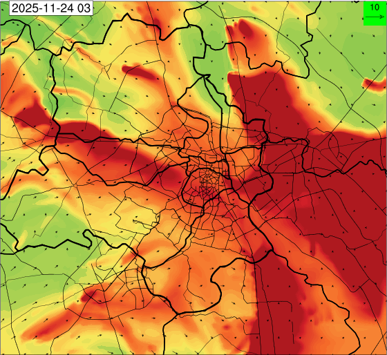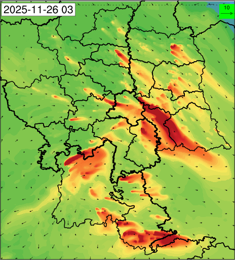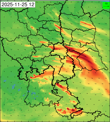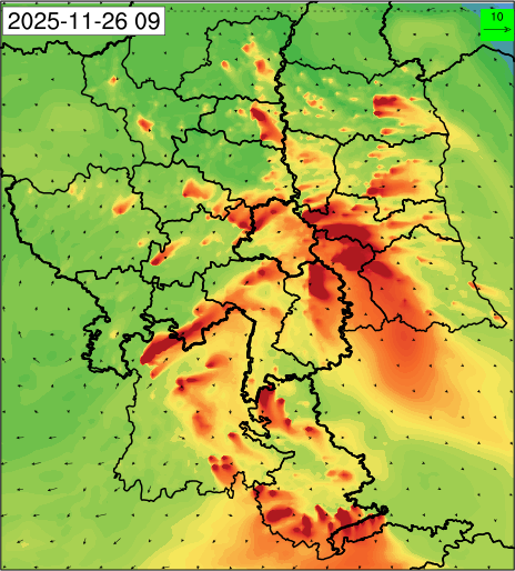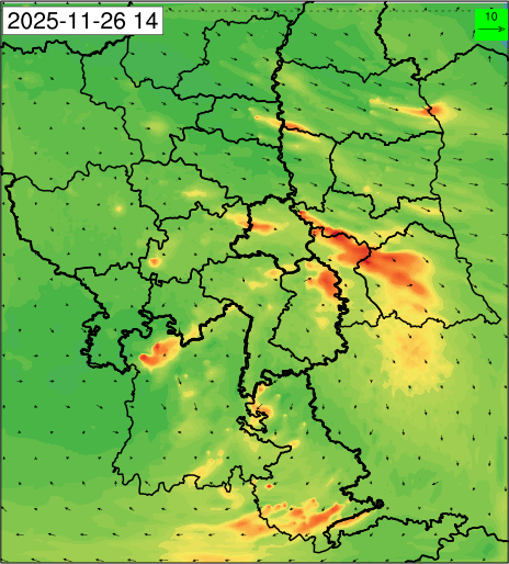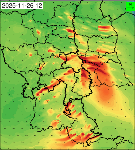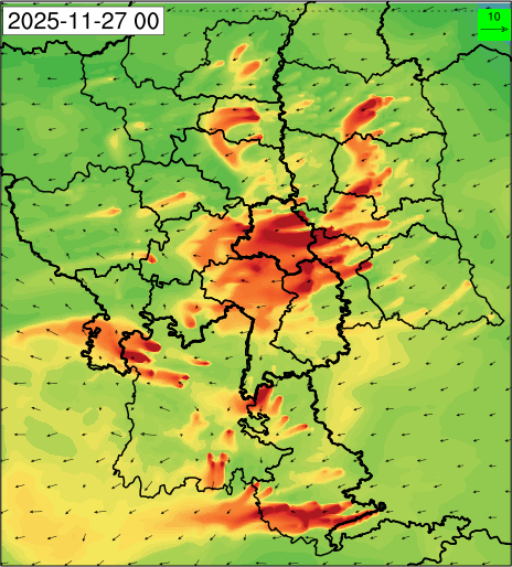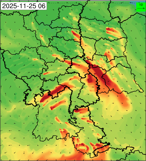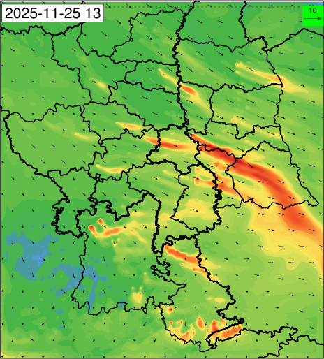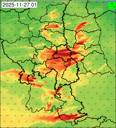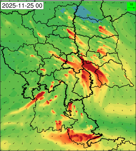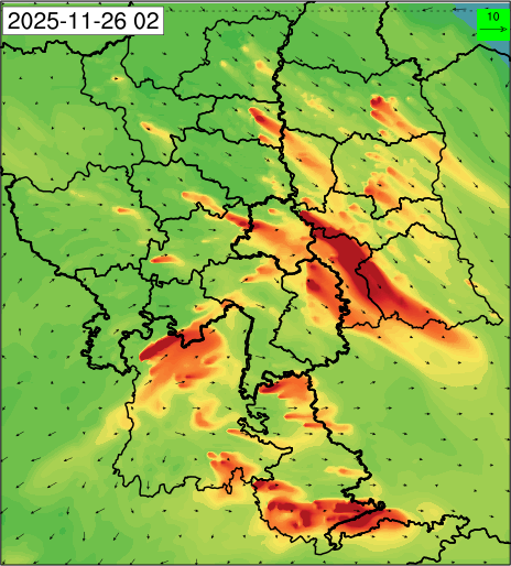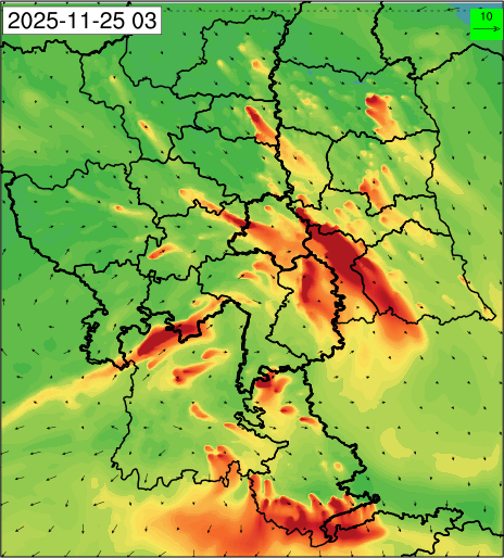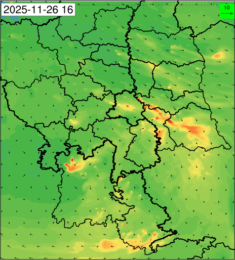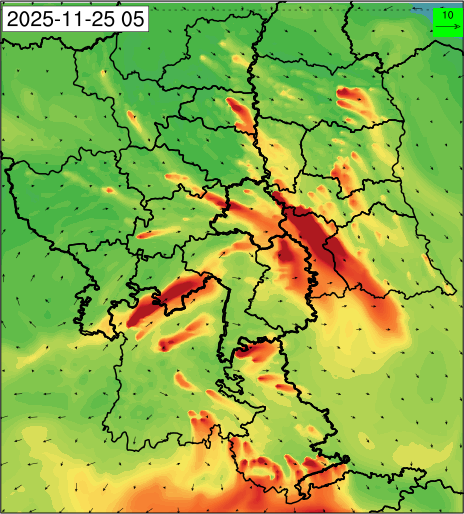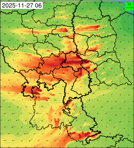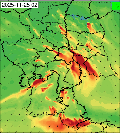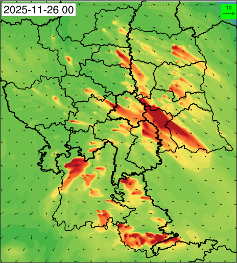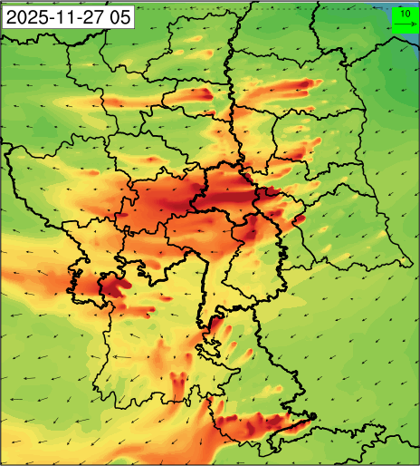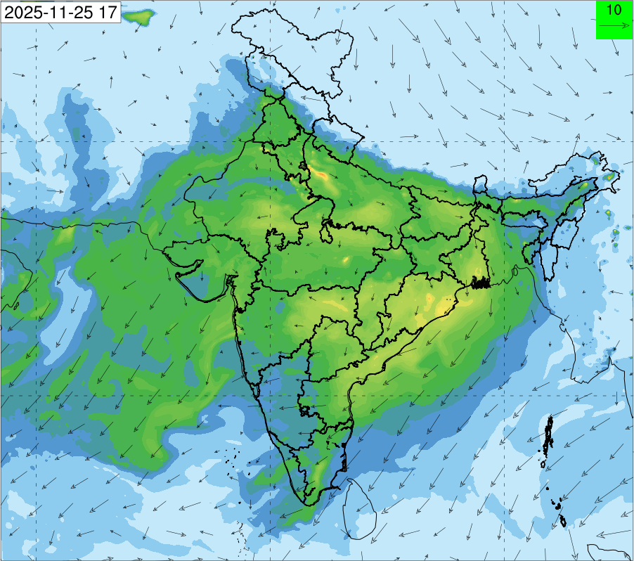 1. Past Weather and Air Quality Observation: The air quality over Delhi was in Very poor category with CPCB AQI 353 at 4 PM on 25.11.2025. There has been a slight fall in minimum and maximum temperatures by 01°C during the past 24 hours over Delhi. The maximum and minimum temperatures over Delhi were around 24 to 26 °C and 07 to 10°C, respectively. The minimum temperatures are appreciably below normal (-3.3 to 5.1°C) at most places and below normal (-1.6 to -2.5 °C) at many places in Delhi. The maximum temperatures are appreciably below normal (-3.1 to 5.0°C) at isolated places and below normal (-1.6 to -3.0 °C) at many places and normal (-1.5 to 1.5°C) at a few places over Delhi. Smoke was reported at Palam Airport. Mainly clear sky conditions with predominant surface wind from the west direction with a wind speed up to 12 kmph prevailed during the past 24 hours. Mainly clear sky conditions with calm wind in early morning hours, gradually increasing up to 06 kmph from the southwest direction prevailed over the region in the forenoon today.